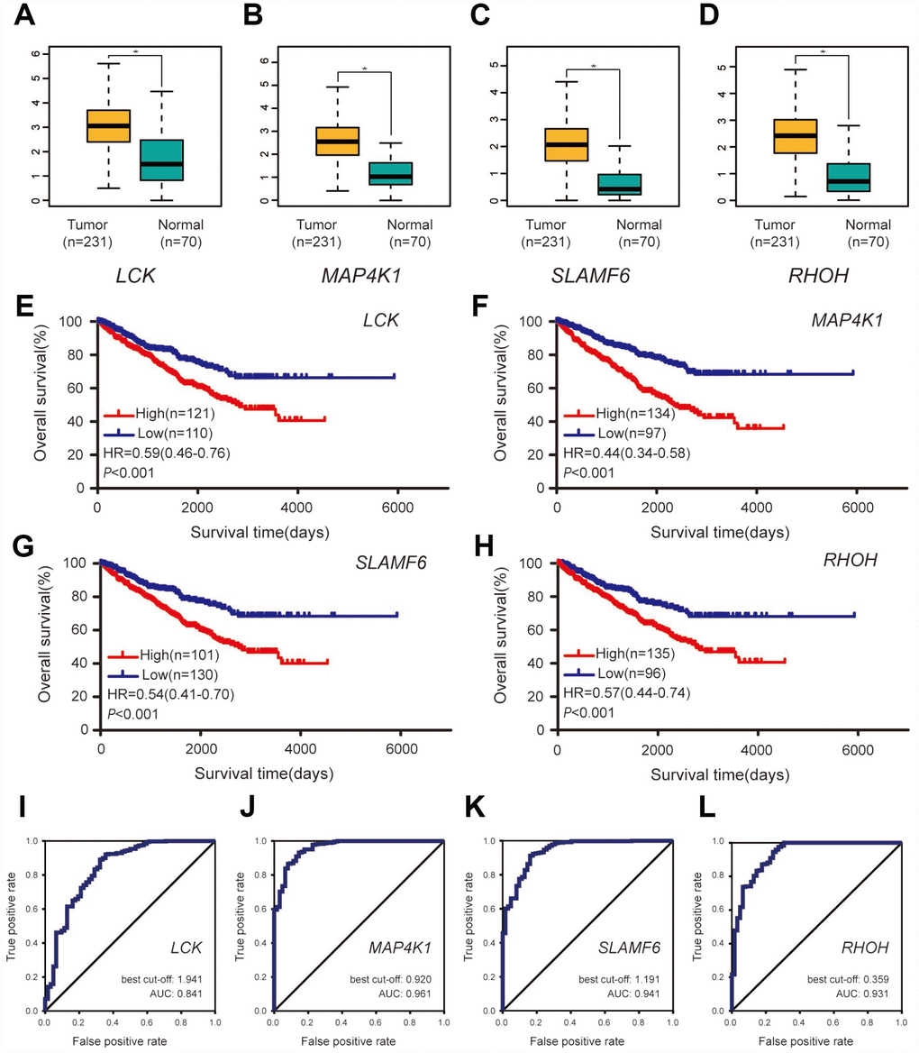 A dataset including 231 cases of ccRCC samples and 70 normal tissues from the ICGC database was used for validation. Compared with normal tissues, all four hub genes revealed higher expression levels in ccRCC samples (Figure 6A–6D). Survival analyses were performed grouped by the differential expression of the four hub genes. Table 2 shows the clinicopathological characteristics in patients with ccRCC from the ICGC cohort. It was found that increased expression levels of LCK (HR 0.59 [0.46–0.76], P<0.001) were associated with poor overall survival of ccRCC patients, as well as MAP4K1 (HR 0.44 [0.34–0.58], P<0.001), SLAMF6 (HR 0.54 [0.41–0.70], P<0.001), and RHOH (HR 0.57 [0.44–0.74], P<0.001) (Figure 6E–6H). In addition, ROC curve analyses were performed to evaluate the capability of the hub genes to distinguish tumor and normal tissues. AUC values for the four genes were greater than 0.5 (Figure 6I–6L).