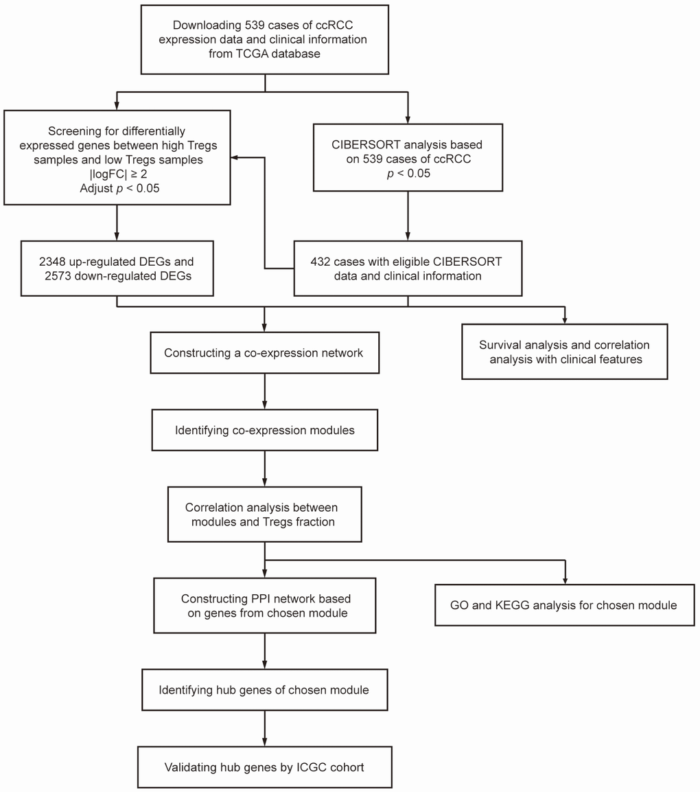 A workflow of this study is shown in Figure 7. We downloaded mRNA expression profiles, including 539 cases of ccRCC samples, from the Cancer Genome Atlas (TCGA) database (https://portal.gdc.cancer.gov/) and cases without adequate clinical data were excluded. We used the CIBERSORT algorithm to evaluate tumor-infiltrating immune cells based on TGCA cohort. Meanwhile, survival analyses and correlation analyses with clinical features were conducted to evaluate the clinical significance of each type of immune cell. After screening the differentially expressed genes (DEGs) between samples with high and low proportions of Treg cells, WGCNA was conducted to determine the module relative to Treg cells. Gene Ontology (GO) analysis and pathway enrichment analysis were performed for functional annotation of selected modules. A protein–protein interaction (PPI) network was built and hub genes were selected according to the degree of connectivity. Meanwhile, an additional independent dataset of 231 cases of ccRCC samples and 70 normal kidney samples from the International Cancer Genomics Consortium (ICGC) database (https://dcc.icgc.org/) was used as a validation set.