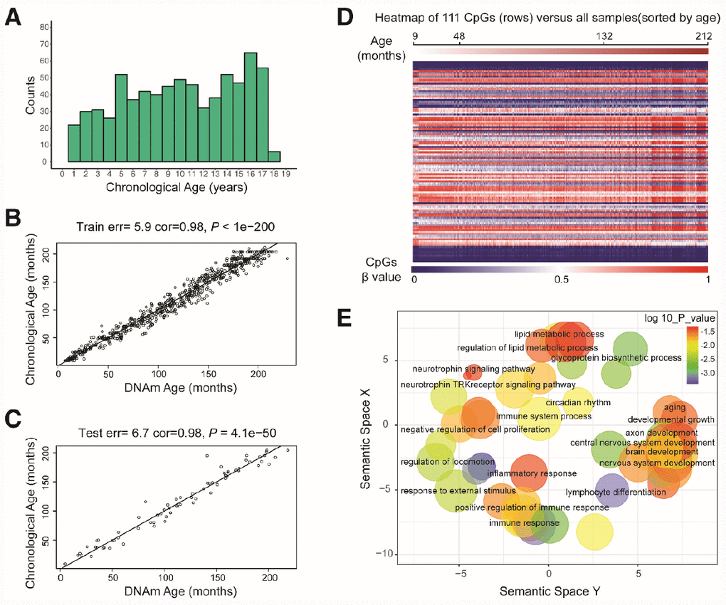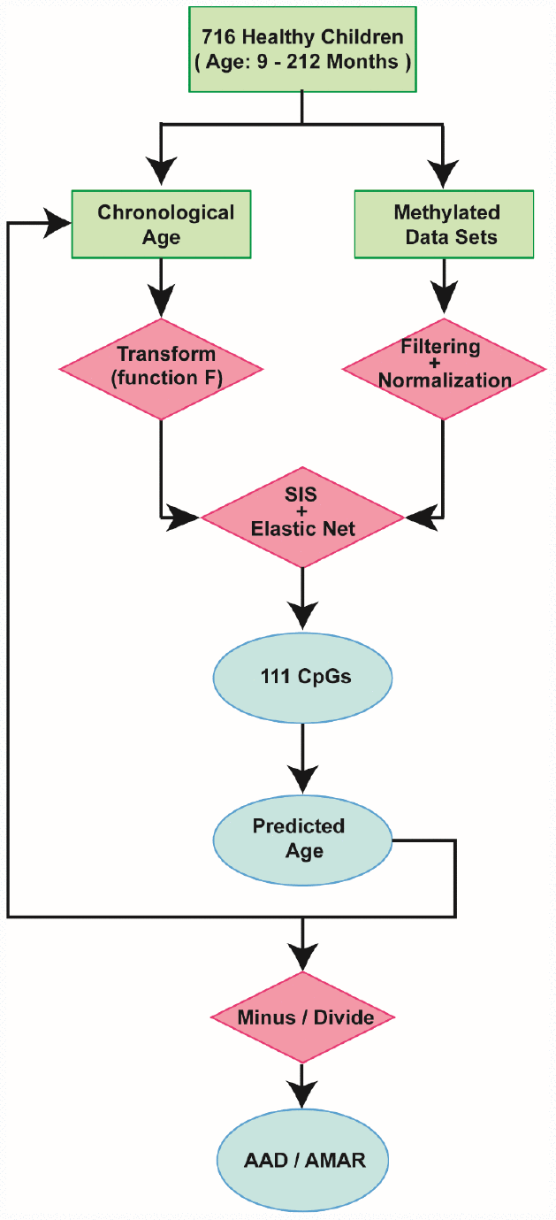 Thus far, the most remarkable biological age predictor has been the epigenetic clock. Hannum et al. built a quantitative model of aging by measuring over 450,000 CpG markers in whole blood samples from 656 human subjects aged 19 to 101 years [14]. Horvath et al. developed a biomarker of aging called the multi-tissue predictor based on DNA methylation levels [15]. Using only three CpG sites, Weidner et al. constructed an age prediction model that was more precise than techniques based on telomere length [16]. The above studies demonstrated the feasibility of biological age prediction based on DNA methylation, but these models were mostly focused on adults. Although some of these predictive models included samples from children, the large age range (0–101 years old) and age unit (years) of these models reduced their accuracy both in predicting the biological ages of children (0 - 18 years old) and in revealing biologically relevant epigenetic abnormalities.