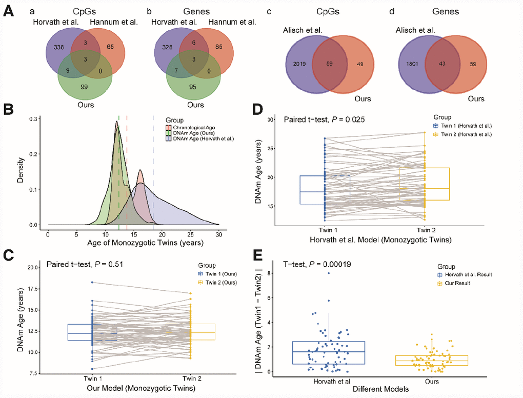 Paired Student’s t-tests were used to compare the DNA methylation ages calculated by our model and the multi-tissue predictor for 67 pairs of monozygotic twins in the dataset GSE56105 [23]. Differences between two groups of samples were assessed with Wilcoxon tests and unpaired Student’s t-test, while differences among multiple groups of samples were assessed with analysis of variance (ANOVA). P values < 0.05 were considered significant. Statistical analyses were performed with RStudio.