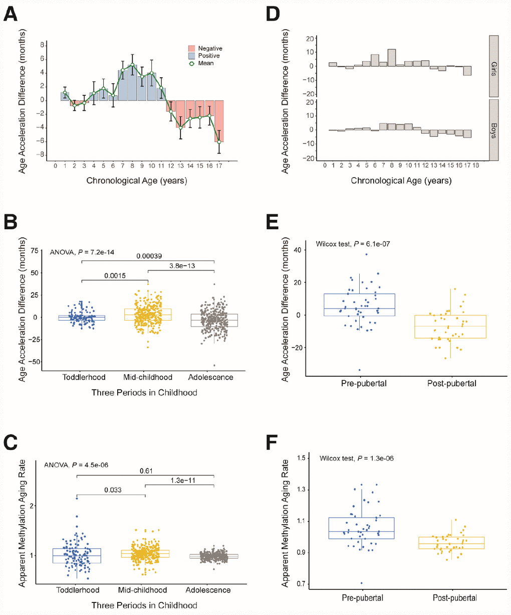 To verify the above results, we analyzed an independent dataset from the study of Almstrup et al. [18]. These authors described longitudinal whole-genome changes in DNA methylation in peripheral blood samples (n = 84) before and after adolescence in 42 healthy children. Coincidentally, the pre-puberty (5.6–11.3 years) and post-puberty (12.2–16.4 years) age segments in their study were almost the same as our mid-childhood and adolescent age settings, so we could use this dataset to verify our results. As expected, the rate of aging was significantly higher before puberty than after puberty (AAD: P = 6.1×10-7, AMAR: P = 1.3×10-6, Wilcoxon test; Figure 4E and 4F). The conclusion of the study by Almstrup et al. also confirmed this finding.