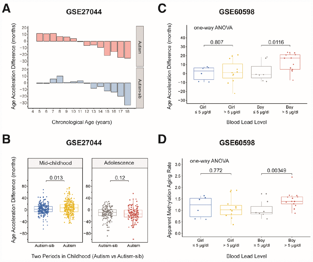 Using the dataset GSE27044 (details in Supplementary Table 4), we analyzed the association of the three types of autism (autism, autism spectrum disorder and Asperger syndrome) with the DNA methylation age (Supplementary Figure 4A) [17]. We found no significant difference in the AAD or AMAR between these three types of autistic children and their unaffected siblings (AAD: P = 0.47, AMAR: P = 0.098, ANOVA; Supplementary Figure 4B and 4C).