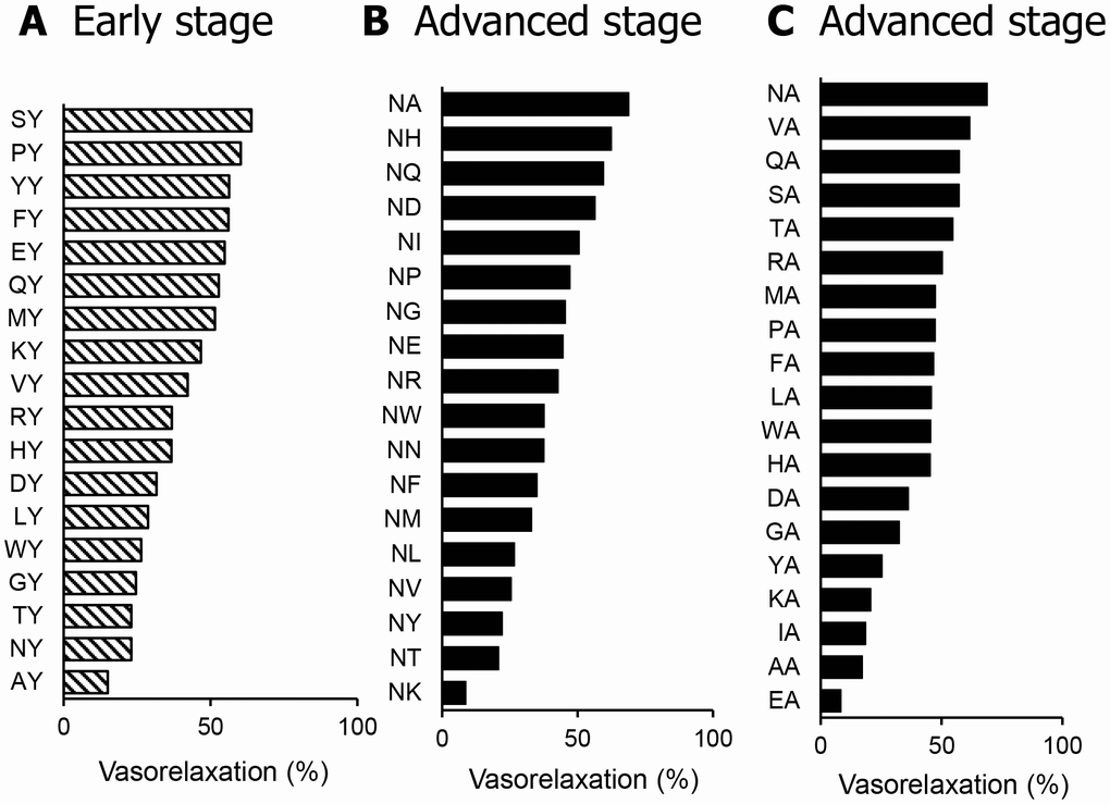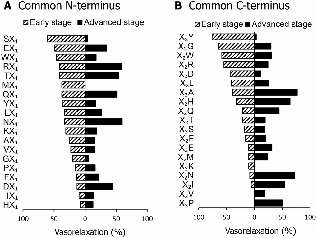 We measured the vasorelaxation activity of 38 dipeptide mixtures, which consisted of the specific N-terminal or C-terminal residues, using the mesenteric artery of SHR with early or advanced hypertension. As shown in Figure 1A and 1B, the vasorelaxation activity of the dipeptide mixtures markedly differed between SHR with early and advanced hypertension. In SHR with early hypertension, the dipeptide mixture that consisted of the C-terminal tyrosine residue (X2Y) exhibited the most potent vasorelaxation effects. In contrast, in SHR with advanced hypertension, the dipeptide mixtures that consisted of the N-terminal asparagine residue (NX1) or C-terminal alanine residue (X2A) exhibited the most potent vasorelaxation effects.