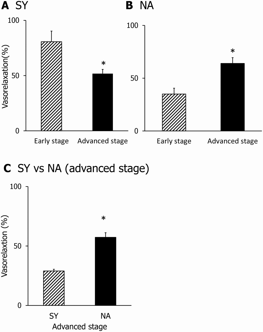 Next, we investigated whether SY- and NA-induced vasorelaxation activity was affected by aging. SY-induced vasorelaxation activity was significantly attenuated in SHR with advanced hypertension, as shown in Figure 3A. In contrast, NA-induced vasorelaxation activity was higher in SHR with advanced hypertension (Figure 3B). Furthermore, we directly compared the vasorelaxing activity of NA and SY (Figure 3C). NA-induced vasorelaxation activity was significantly greater than that induced by SY in SHR with advanced hypertension. These results support that aging affects the function of arteries.