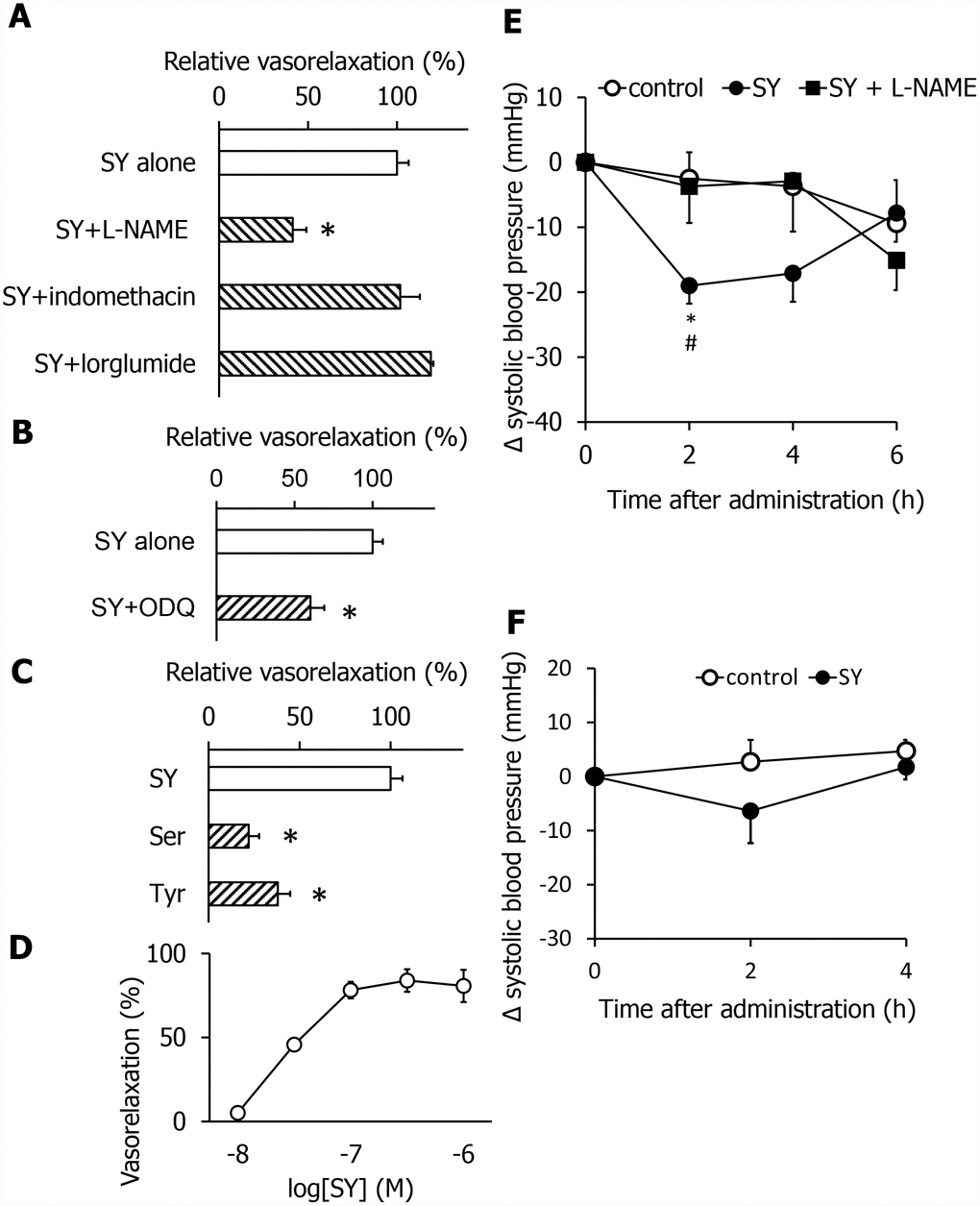 To explore the mechanism of the vasorelaxation effects of SY, we used three vasorelaxation inhibitors, lorglumide, indomethacin, and L-NAME, in combination with SY. The SY-induced vasorelaxation activity was not blocked by lorglumide, an antagonist of the cholecystokinin CCK1 receptor, or indomethacin, a cyclooxygenase inhibitor. In contrast, the activity was inhibited by L-NAME, a NO synthase inhibitor (Figure 4A). This suggests that SY exhibits vasorelaxation activity via the NO pathway, which is independent of known CCK and prostaglandin systems. It is known that NO stimulates guanylate cyclase in the vascular smooth muscle to produce cGMP, which induces vasorelaxing effects. ODQ, an inhibitor of guanylate cyclase, also blocked the SY-induced vasorelaxing effects (Figure 4B). Thus, we demonstrated that SY stimulates the NO/cGMP pathway. Next, we investigated the dose dependency. As shown in Figure 4D, SY dose-dependently relaxed the mesenteric artery. To further investigate whether SY exhibits hypotensive effects, we measured systolic blood pressure (SBP) using the tail-cuff method. Orally administered SY (5 mg/kg) significantly reduced the SBP in young SHR (Figure 4E). The amino acids composing the dipeptide SY did not exhibit vasorelaxing effects (Figure 4C), suggesting that the partially absorbed dipeptide acts on the vascular system. In addition, the hypotensive effects of SY were inhibited by pretreatment with L-NAME (20 mg/kg, i.p.) (Figure 4E). Therefore, SY-induced hypotensive effects and vasorelaxation effects are mediated by the NO pathway. The antihypertensive effects of oral SY in SHR with advanced hypertension were weaker than those in SHR with early hypertension (Figure 4F).