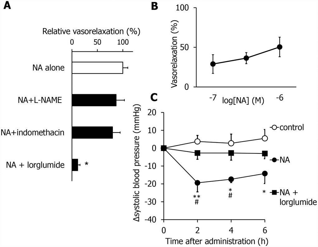 To elucidate the mechanism underlying the vasorelaxation effects of NA, we again used three vasorelaxation inhibitors, lorglumide, indomethacin, and L-NAME, in combination with NA. The NA-induced vasorelaxation activity was blocked by neither L-NAME nor indomethacin (Figure 5A). In contrast, the activity was inhibited by lorglumide. These results suggest that NA exhibits vasorelaxation activity in a CCK-dependent manner, which is independent of known NO and prostaglandin systems. Next, we investigated its dose dependency. NA dose-dependently relaxed the mesenteric artery, as shown in Figure 5B. To further investigate whether NA exhibits hypotensive effects, we measured the SBP using the tail-cuff method. Orally administered NA (1.5 mg/kg) significantly reduced the SBP in SHR with advanced hypertension (Figure 5C). The hypotensive effects lasted for 6 hrs. In addition, the hypotensive effects of NA were inhibited by pretreatment with lorglumide (Figure 5C). These results suggest that NA has potent and long-lasting hypotensive activity in a CCK-dependent manner.