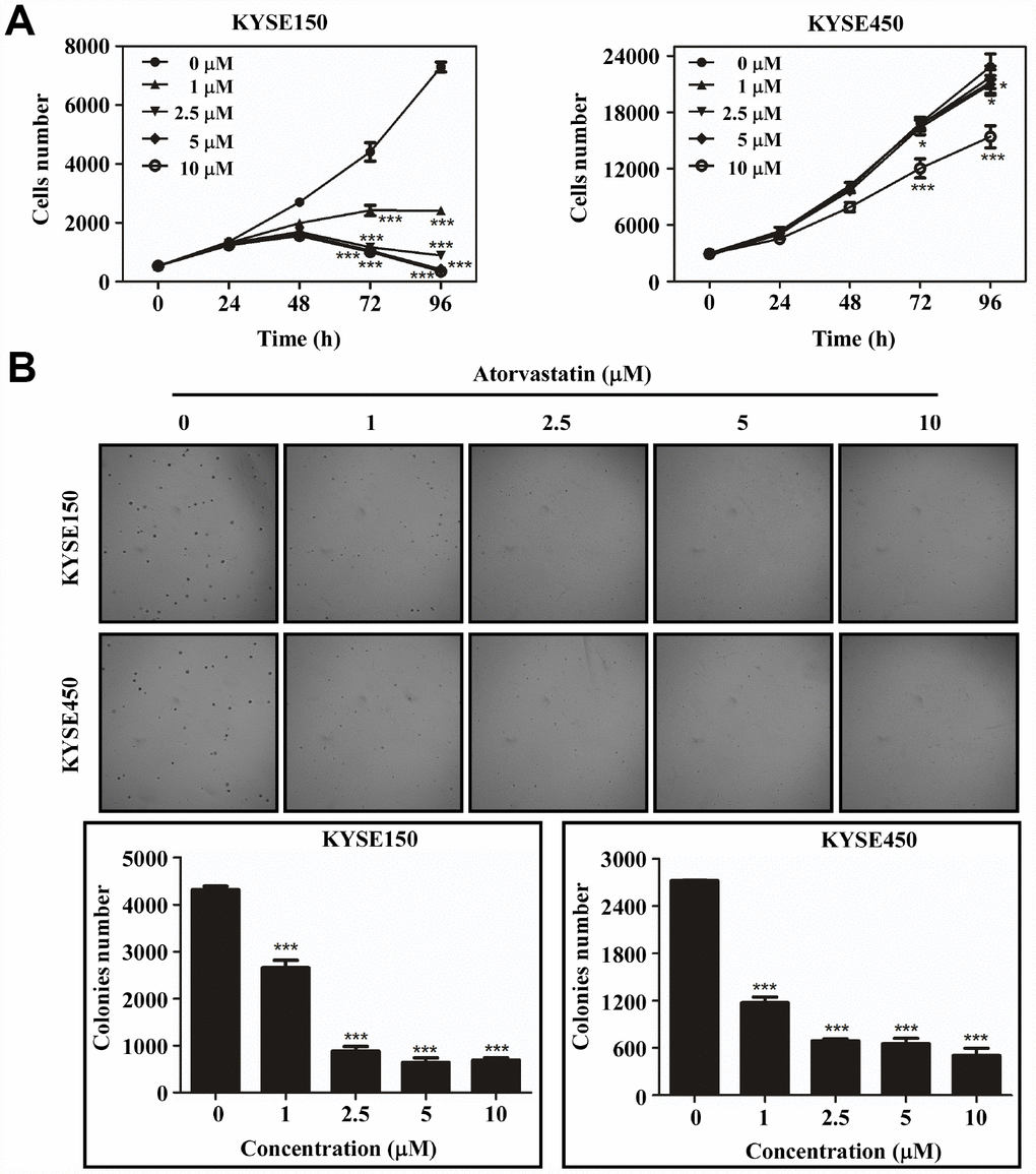 To evaluate the effect of atorvastatin on ESCC growth, we treated KYSE150 and KYSE450 cells with different concentrations of atorvastatin. The results indicated that atorvastatin significantly attenuated growth of ESCC cells in a dose-dependent manner (Figure 1A) while having less effect against normal esophageal epithelial cell line SHEE (Supplementary Figure 1A). Next, the effect of atorvastatin on anchorage-independent growth of ESCC cells was evaluated by soft agar assay. Data suggested that atorvastatin treatment strongly inhibited anchorage-independent growth of KYSE150 and KYSE450 cells (Figure 1B). Therefore, atorvastatin inhibited the proliferation and anchorage-independent growth of ESCC cells.