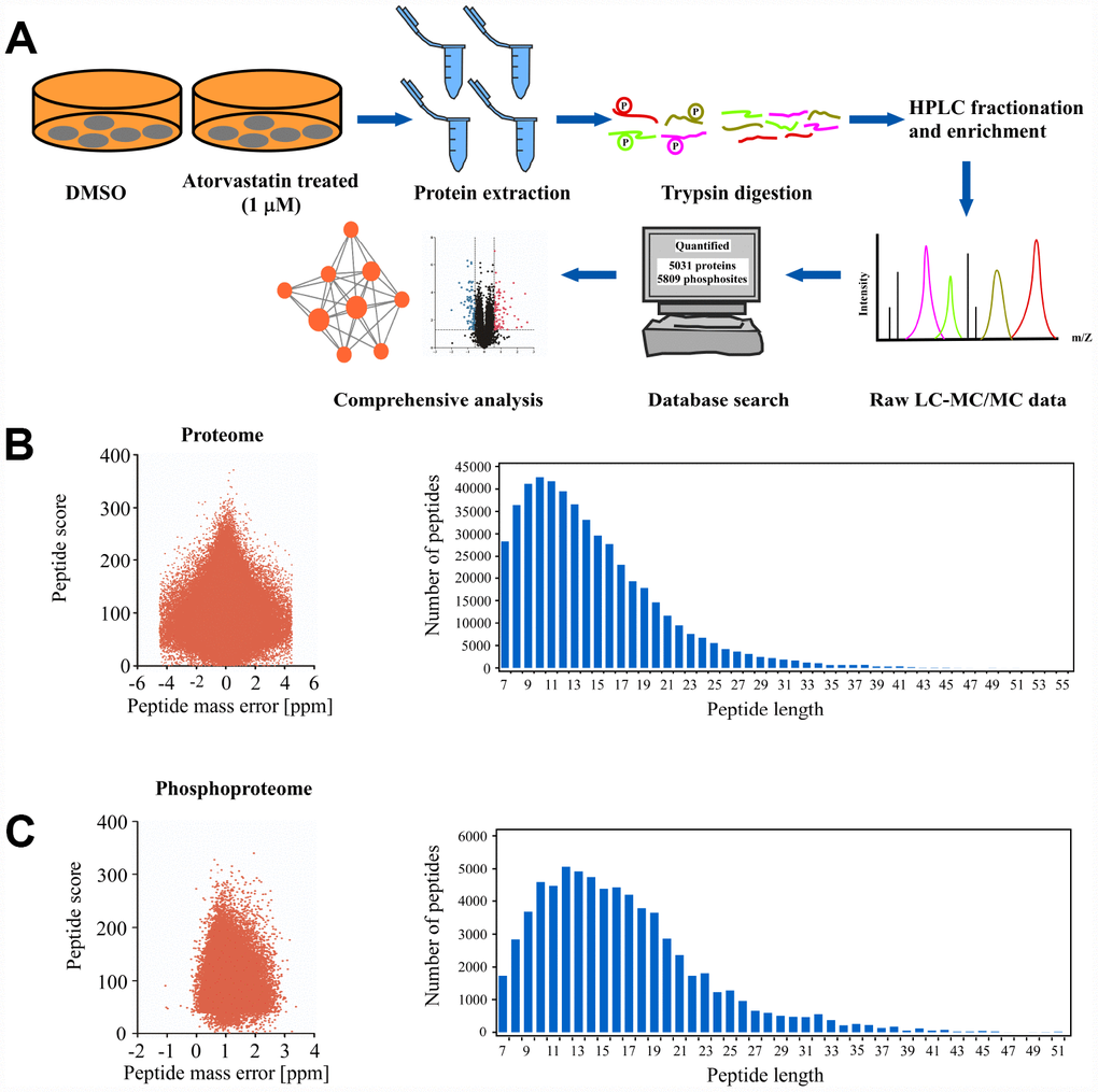 In order to comprehensively investigate the anti-mechanism of atorvastatin in ESCC, the KYSE150 cells were exposed to 1 μM atorvastatin or DMSO as control for 24 h. Subsequently, Mass spectrometry was performed. The whole experiment strategy was developed for quantitative (phosphor) proteomic profiles of atorvastatin-induced alteration with 3 biological replicates (Figure 2A). This approach quantified 5031 proteins (Supplementary Table 1) and 5809 phosphosites (Supplementary Table 2). The quality control report indicated that this test was in line with the standards (Figure 2B–2C).
