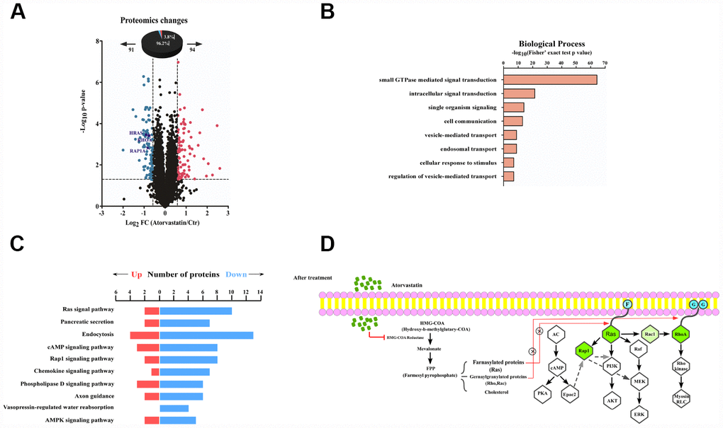 We quantified and analyzed proteins from the raw database. A total of 185 proteins (3.6% of the 5031 proteins) significantly changed after atorvastatin treatment, among which 94 were up-regulated and 91 proteins were down-regulated respectively (Figure 3A). Interestingly, we found many down-regulated proteins correlated to the development of cancer. To thoroughly understand the role of the down-regulated proteins in the anti-tumor effect of atorvastatin, we annotated the function and characteristics of these proteins from the Gene Ontology (GO) and Kyoto Encyclopedia of Genes and Genomics (KEGG). GO analysis indicated the most two significantly changed biological processes were small GTPase mediated signal transduction and intracellular signal transduction. In addition to these observations, other functional categories are listed (Figure 3B). Consistent with GO analysis, the KEGG database showed that most drug-altered proteins were related to the Ras signal pathway (Figure 3C). The data also demonstrated that a large number of treatment-changed proteins were associated with the cAMP signal pathway and the Rap1 signal pathway (Figure 3C). In proteomic profiles, RhoA, Rap1, and Ras were strongly down-regulated, involved in these pathways mentioned above (Figure 3A). Multilayered proteomic results prompted us to depict a schematic of pathway interaction and protein alterations mediated by atorvastatin (Figure 3D). The picture showed that atorvastatin decreased the production of the mevalonate pathway by inhibiting HMG-CoA reductase, which is required for small G-protein activity, such as Ras and RhoA. In addition to these changes consistent with previous research, the proteome profile suggested the functional roles of altered proteins upon atorvastatin in the regulation of cAMP and Rap1 signal pathway.