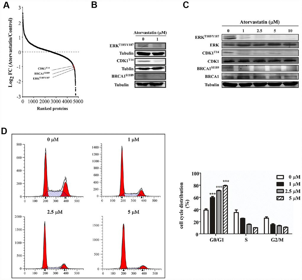 Atorvastatin was purchased from Sigma (USA) for cell experiments. The powder was dissolved into DMSO (Sigma-Aldrich, USA) at 50 mM. Atorvastatin was purchased from Pfizer for animal experiment. ERKT185/Y187, CDKT14 were obtained from Thermo Fisher Scientific. BRCA1S1189 was purchased from Abcam. ERK, CDK1, and BRCA1 were obtained from Cell Signaling Technology.