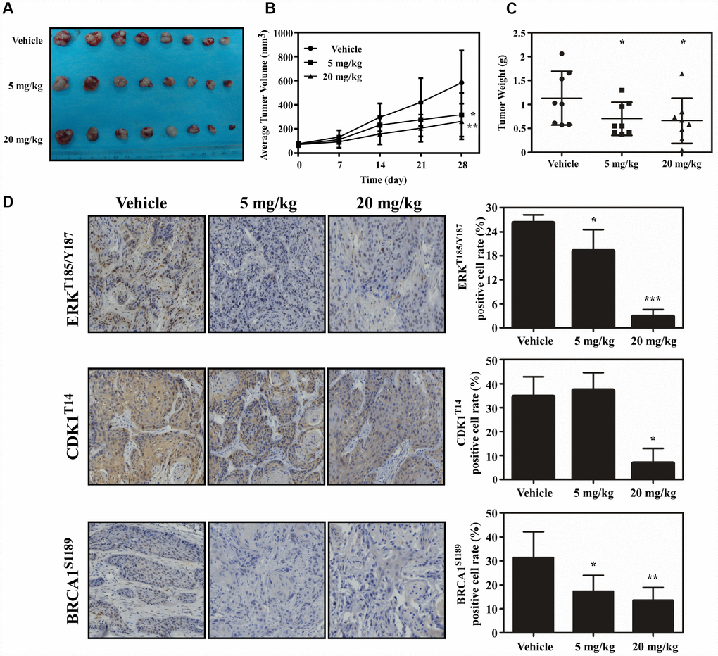 PDX model was conducted to evaluate the anti-tumor activity of atorvastatin in vivo. Tumor tissue from patients was implanted into the backs of SCID mice. The mice were given atorvastatin (5 mg/kg, 20 mg/kg), or vehicle, every day over a period of 28 days. The results showed that atorvastatin significantly suppressed the volume of tumor compared with the vehicle group (Figure 6A–6B). When the mice were sacrificed, the weight of the tumor tissue was measured and the results showed that tumor weight was inhibited in mice treated with atorvastatin (Figure 6C). Additionally, mice subjected to atorvastatin treatment did not show toxicity based on the fact that body weight no loss (Supplementary Figure 1B). We then determined the findings of the phosphoproteomic profile at the tissue level by using immunohistochemistry. The results demonstrated that atorvastatin markedly decreased phosphorylation of CDK1T14, BRAC1S1189 and ERKT185/Y187 (Figure 6D).