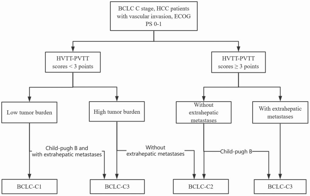 Hepatocellular carcinoma (HCC) is the fifth most common neoplasm and the third leading cause of cancer death worldwide [1]. HCC has a tendency to invade the vascular system, and it has been reported that approximately 40% of HCC patients have a vascular tumor thrombus when first diagnosed [2, 3]. HCC patients with macroscopic vascular invasion have an extremely poor prognosis, with a median overall survival (OS) of 2.7-4.0 months [4, 5]. The Barcelona Clinic for Liver Cancer (BCLC) staging system recommended systemic therapy as the standard therapy [6], but the greatest reported survival benefit of sorafenib monotherapy was less than 3 months [7]. Additionally, HCC with vascular invasion have been gradually accepted to have different disease behaviors and prognosis, and some of these patients may benefit from aggressive treatments [8]. Therefore, sub-classification of HCC with vascular invasion is important for the development of personalized management strategies.