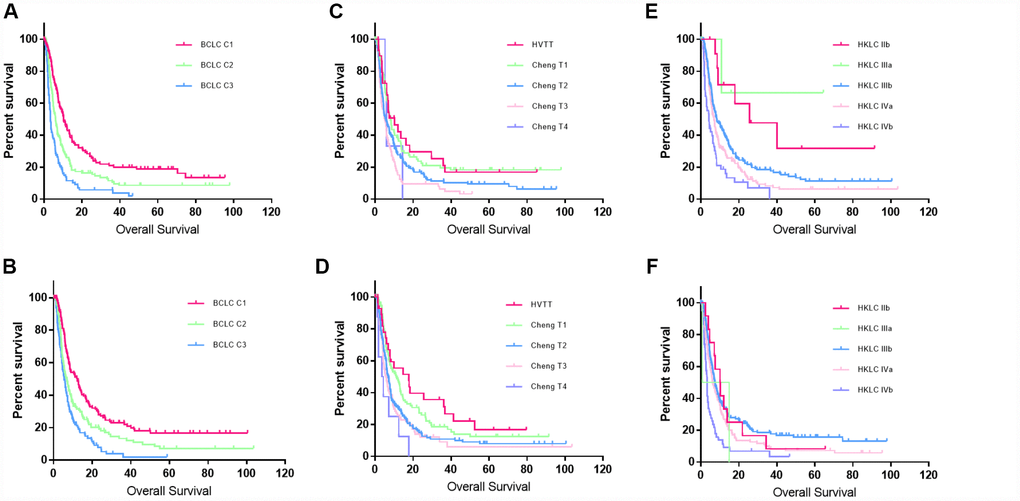 Many sub-classification systems have been developed for HCC with vascular invasion. Previous reports showed that the extent of the portal vein tumor thrombus (PVTT) was associated with the prognosis [9]. In Eastern countries, two classification systems based on the extent of PVTT are widely accepted: Cheng’s classification system (Types I-IV) and the Japanese staging system (Vp1-Vp4) [10, 11]. However, without evaluation of clinical performance status, liver function and tumor burden, these two systems are not comprehensive for management of HCC patients with tumor thrombus [12]. In addition, hepatic vein tumor thrombus (HVTT) including hepatic vein tumor thrombus, inferior vena cava tumor thrombus (IVTT) and right atrium tumor thrombus was not involved in these two staging systems due to their rarity [13, 14]. In fact, the incidence of HVTT has been reported to be 1.4-4.9%, and approximately 10% of HCC cases with PVTT are combined with HVTT [15, 16]. Therefore, HVTT should also be incorporated into the staging system for HCC with vascular invasion. The Hong Kong Liver Cancer (HKLC) staging system was developed containing both HVTT and PVTT and offers more aggressive treatments for HCC patients than BCLC staging system [17]. However, when patients present with intrahepatic tumor thrombus, the prognosis is difficult to predict and the therapeutic strategy seems ambiguous [18]. The HKLC staging system built a totally different classification for HCC patients with tumor thrombus compared with BCLC staging system, but a sub-classification of BCLC-C stage might be more practical because of the widely use of BCLC staging system in clinical.
