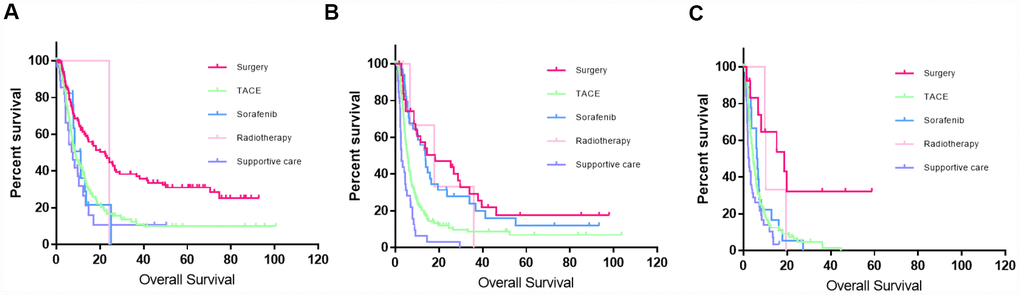 The corresponding treatment guidance was proposed after analyzing the prognosis of patients in different stages. For patients in BCLC-C1, liver resection significantly improved the prognostic outcomes compared with other treatments. The median OS for patients who received liver resection and other treatments was 24.2 and 8.5 months, respectively. Although a large proportion of the patients received TACE, the median OS was not improved significantly compared with the supportive care group. For patients in BCLC-C2, although many therapeutic strategies could improve the prognostic outcomes compared with supportive care, patients who underwent liver resection or sorafenib had better survival outcomes. However, no statistical difference in the survival outcomes was found between liver resection and sorafenib. For patients in BCLC-C3, although surgery could significantly prolong the median OS, less than 5% of patients were suitable for liver resection. For patients who received sorafenib, TACE alone, and supportive treatment, none of these treatments significantly benefited survival.