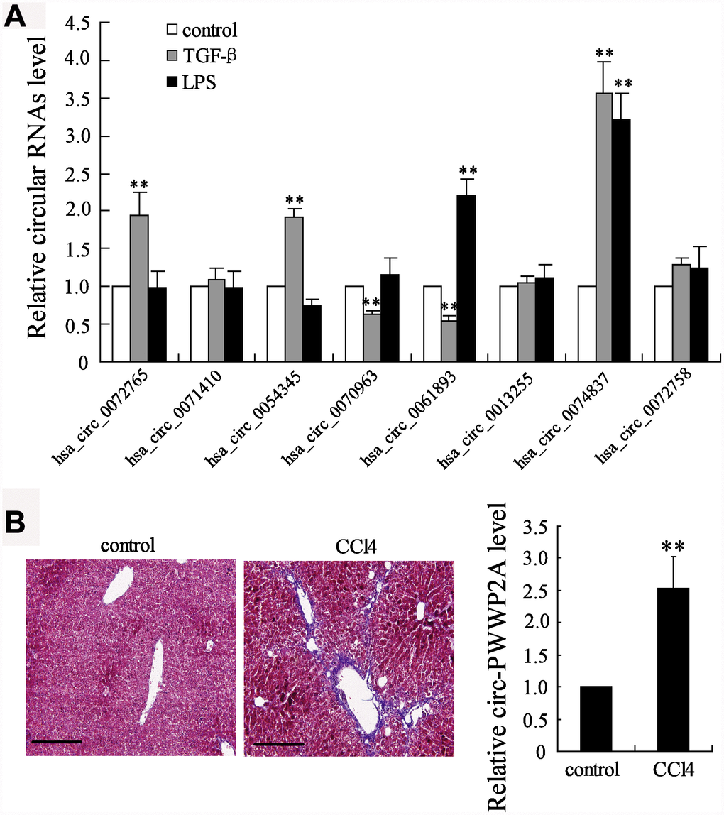 CircRNAs have been reported to take part in the activation of HSCs, the main fibrogenic cell type in hepatic fibrosis [19]. The different expressions of several circRNAs, including hsa_circ_0072765, hsa_circ_ 0071410, hsa_circ_0054345, hsa_circ_0070963, hsa_circ_0061893, hsa_circ_0013255, hsa_circ_0074837, and hsa_circ_0072758, were compared in TGF-β- or LPS-activated HSCs. The simultaneous enhancement of the expression of hsa_circ_0074837 (also named as circ-PWWP2A in human genome) in both TGF-β- and LPS-activated HSCs suggested it may play a critical role in HSC activation (Figure 1A). Then, its expression in CCl4-induced fibrosis mouse model was further detected, and the expression of mmu_circ_0000254 (the circ-PWWP2A in mouse genome) was markedly higher in fibrotic liver tissues than that in normal liver tissues (Figure 1B). Thus, circ-PWWP2A was chosen for further investigations against hepatic fibrogenesis.