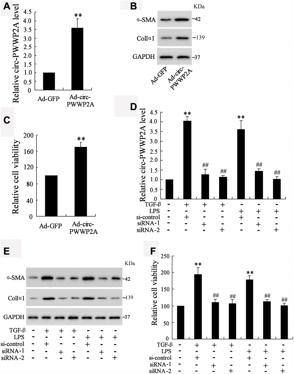 Given the upregulation of circ-PWWP2A in activated HSCs and fibrotic liver tissues, we further explored whether circ-PWWP2A regulates the activation and proliferation of HSCs. The result showed that overexpressing circ-PWWP2A using Ad-circ-PWWP2A transfection in LX-2 cells (Figure 2A) increased protein expression of α-SMA and Col1α1, both of which were activated HSC markers (Figure 2B), and it also promoted HSC proliferation (Figure 2C). Interfering circ-PWWP2A using siRNA of circ-PWWP2A in TGF-β- or LPS-activated LX-2 cells (Figure 2D) reduced protein expression of α-SMA and Col1α1 (Figure 2E), and it inhibited the proliferation of activated-HSCs (Figure 2F). These findings indicated that circ-PWWP2A positively regulates the activation and proliferation of HSCs.
