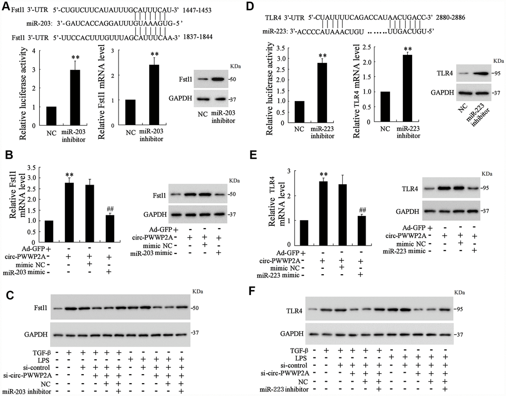As the interaction between circ-PWWP2A with miR-203 and miR-223 was elucidated, the targets of miR-203 and miR-223 remained unclear. Using the online predicting software Targetscan, we found the potential targets of miR-203 and miR-223 which were Fstl1 and TLR4, respectively. The luciferase reporter vector carrying mutant Fstl1 3’-UTR was transfected into 293T cells along with miR-203 inhibitor, and the luciferase activity was enhanced by such transfection. Meanwhile, miR-203 inhibition increased both mRNA and protein level of Fstl1 (Figure 4A). In LX-2 cells, simultaneously overexpressing circ-PWWP2A and miR-203 decreased the enhancement of mRNA and protein expression of Fstl1 raised by overexpressing circ-PWWP2A alone (Figure 4B). In TGF-β- or LPS-activated LX-2 cells, simultaneously interfering circ-PWWP2A and miR-203 restored the defect of Fstl1 protein expression caused by interfering circ-PWWP2A alone (Figure 4C). These data indicated that circ-PWWP2A regulates Fstl1 via sponging miR-203, and the similar relationship of circ-PWWP2A/miR-223/TLR4 was confirmed in Figure 4D–4F.