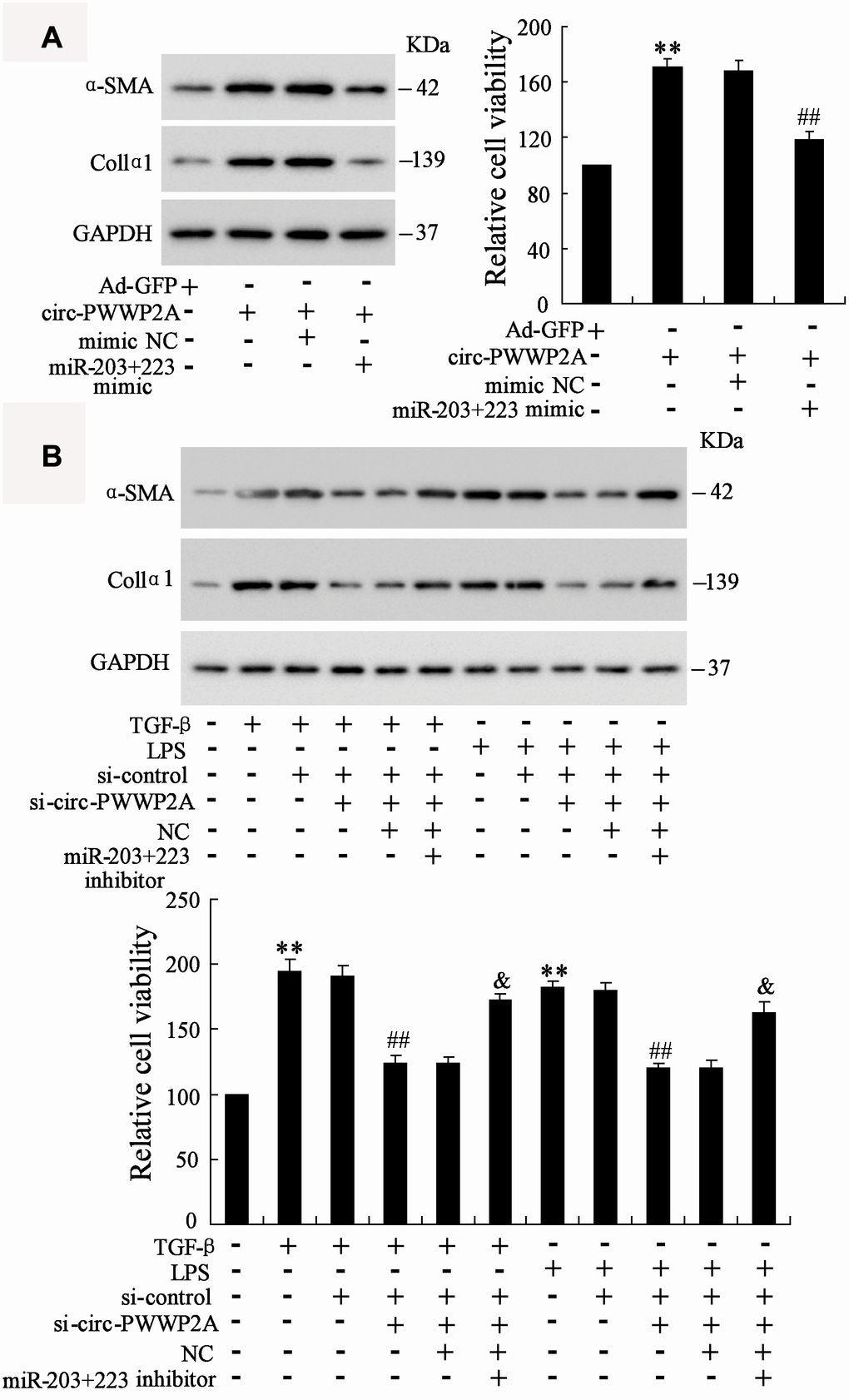 In LX-2 cells, overexpressing circ-PWWP2A increased the protein expression of α-SMA and Col1α1 and promoted HSC proliferation, whereas the co-transfection with miR-203+223 mimic negated such response (Figure 5A). In TGF-β- or LPS-activated LX-2 cells, interfering circ-PWWP2A reduced the protein expression of α-SMA and Col1α1 and inhibited HSC proliferation, whereas the co-transfection with miR-203+223 inhibitor negated such response (Figure 5B). These data suggested that circ-PWWP2A promotes activation and proliferation of HSCs via regulating miR-203 and miR-223.