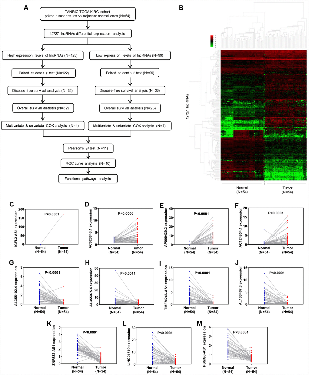 The flow chart in Figure 1A was created in order to break down the present study step by step. LncRNA expression profiles were downloaded from the TANRIC database, which included 12,727 lncRNAs and 515 patient samples. Fifty-four paired normal and tumor samples were included in the cohort, and hierarchical clustering heatmap analysis was performed using R package ‘edgeR’ with |log2FC|>1, adjusted P<0.05 and FDR<0.01 (Figure 1B). The analysis identified 125 upregulated and 99 downregulated lncRNAs, which indicated that these differentially expressed genes could distinguish ccRCC from normal tissues (Supplementary Tables 1–2). To validate these results, we further examined the relative lncRNA expression levels between 54 normal and tumor samples using paired student's t-test. Out of the 125 upregulated lncRNAs, a statistically significant difference in relative expression was identified in 122, while all 99 of the downregulated lncRNAs passed the statistical tests (Figure 1C–1M, Supplementary Figures 1–4).