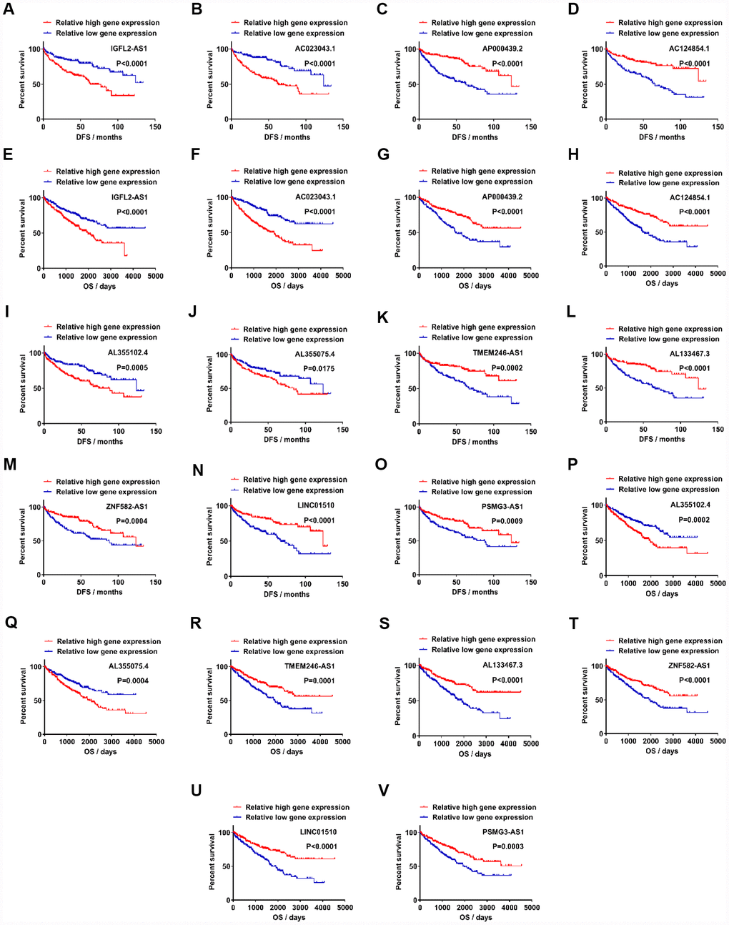To determine which lncRNAs were associated with the prognosis of cancer patients, 122 upregulated lncRNAs were analyzed in relation to DFS. Samples from the TCGA-KIRC database (n=356) were divided into two groups, according to candidate lncRNA expression (from high to low; Supplementary Table 3). Out of 122 upregulated lncRNAs, 32 exhibited statistical difference between relative high gene expression and relative low gene expression groups in DFS (Figure 2A–2D, Supplementary Figure 5). All 32 of the upregulated lncRNAs passed the statistical tests in OS analysis between relative high gene expression and low gene expression groups (Figure 2E–2H, Supplementary Table 4, Supplementary Figure 5). Out of the 99 downregulated lncRNAs, 36 were associated with DFS, while 25/36 exhibited statistical difference in OS (Figure 2I–2V, Supplementary Figure 6). To further verify the role of candidate lncRNAs in prognosis, we applied multivariate and univariate Cox regression analysis. Considering that age and gender are risk factors for RCC and other clinicopathological characteristics, such as T, N, M, grade and stage, are classic diagnostic markers, Cox regression analysis was performed for these factors (age, gender, T, N, M, grade, stage and gene expression) [26]. The results showed that 4/32 upregulated and 7/25 downregulated lncRNAs were valuable both in DFS and OS, which indicated that these 11 candidate lncRNAs could potentially be prognostic indicators for kidney cancer. In multivariate Cox regression analysis for DFS, 10/11 candidate lncRNAs, together with N, M, grade and stage, constituted prognostic factors in ccRCC. AC023043.1, AL355102.4 and AL355075.4 were risk factors with a hazard ratio (HR) >1 (Supplementary Tables 7, 13, 15), while AP000439.2, AC124854.1, TMEM246-AS1, AL133467.3, ZNF582-AS1, LINC01510 and PSMG3-AS1 were protective factors with an HR <1 (Supplementary Tables 9, 11, 17, 19, 21, 23, 25). N, M, grade and stage, which were used for primary diagnosis, all exhibited poor prognosis with advanced levels (N1, M1, G3+G4 and S3+S4). IGFL2-AS1, a risk factor in ccRCC, together with M, grade and stage, were identified as prognostic factors (Supplementary Table 5). In multivariate Cox regression analysis for OS, 9/11 candidate lncRNAs, together with age, M, grade and stage, were found to be prognostic factors in ccRCC. Still, IGFL2-AS1, AC023043.1, AL355102.4 and AL355075.4 were identified as risk factors with an HR >1 (Supplementary Tables 6, 8, 14, 16), while AC124854.1, AL133467.3, ZNF582-AS1, LINC01510 and PSMG3-AS1 were identified as protective factors with an HR <1 (Supplementary Tables 12, 20, 22, 24, 26). AP000439.2 and TMEM246-AS1, together with age, N, M, grade and stage, constituted prognostic factors in ccRCC, among which AP000439.2 and TMEM246-AS1 exhibited protective values (Supplementary Tables 10, 18). Age, which was indirectly associated with patient health status, was identified as a risk factor with an HR >1. The reason why age was a prognostic factor for OS but not DFS, may be due to the larger patient population (445 samples) in the OS analysis cohort.