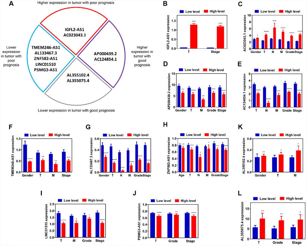 Based on the data from this classified analysis, these 11 lncRNAs were divided into four subgroups, as follows: (i) higher expression in tumor with poor prognosis; (ii) higher expression in tumor with good prognosis; (iii) lower expression in tumor with good prognosis; (iv) lower expression in tumor with poor prognosis (Figure 3A). Pearson’s χ2 test was performed to determine whether lncRNAs were closely associated with clinicopathological factors of kidney cancer patients (Supplementary Tables 27–37). To visualize and clarify these relationships, we divided patient samples into two subgroups, according to corresponding characteristics (age <=60 vs age >60, female vs male, T1+T2 vs T3+T4, N0 vs N1, M0 vs M1, G1+G2 vs G3+G4, S1+S2 vs S3+S4), which exhibited statistical differences with respect to each lncRNA expression after Pearson’s χ 2 test. IGFL2-AS1 gene expression was closely associated with T and stage, which meant that advanced T and stage kidney cancer patients exhibited higher IGFL2-AS1 expression levels (Figure 3B). The AC023043.1 gene expression was closely associated with gender, T, N, M, grade and stage, which revealed that male patients and advanced T, N, M, grade and stage kidney cancer patients exhibited higher AC023043.1 expression levels (Figure 3C). The AP000439.2 gene expression was closely associated with gender, T, M, grade and stage, which meant that male patients and advanced T, M, grade and stage kidney cancer patients exhibited lower AP000439.2 expression levels (Figure 3D). The AC124854.1 gene expression was closely associated with T, N, M, grade and stage, which revealed that advanced T, N, M, grade and stage kidney cancer patients exhibited lower AC124854.1 expression levels (Figure 3E). The TMEM246-AS1 gene expression was closely associated with gender, T, M and stage, which meant that male patients and advanced T, M and stage kidney cancer patients exhibited lower TMEM246-AS1 expression levels (Figure 3F). The AL133467.3 gene expression was closely associated with gender, T, N, M, grade and stage, which revealed that male patients and advanced T, N, M, grade and stage kidney cancer patients exhibited lower AL133467.3 expression levels (Figure 3G). The ZNF582-AS1 gene expression was closely associated with age, T, N, M, grade and stage, which meant that older patients (>60 years) and advanced T, N, M, grade and stage kidney cancer patients exhibited lower ZNF582-AS1 expression levels (Figure 3H). LINC01510 gene expression was closely associated with T, M, grade and stage, which revealed that advanced T, M, grade and stage kidney cancer patients exhibited lower LINC01510 expression levels (Figure 3I). PSMG3-AS1 gene expression was closely associated with T, grade and stage, which meant that advanced T, grade and stage kidney cancer patients exhibited lower PSMG3-AS1 expression levels (Figure 3J). The AL355102.4 gene expression was closely associated with gender, T and M, which revealed that male patients and advanced T and M kidney cancer patients exhibited higher AL355102.4 expression levels (Figure 3K). The AL355075.4 gene expression was closely associated with T, grade and stage, which meant that advanced T, grade and stage kidney cancer patients exhibited higher AL355075.4 expression levels (Figure 3L). In a word, gene expression differences between normal and tumor samples have no relation to prognosis for survival rates. Impact factors are relative gene expression differences between advanced stages and early stages in tumor samples. That is, in tumor samples with advanced T, N, M, grade, stage and relatively older age, lncRNAs in higher expression levels indicated poor prognosis for ccRCC patients.