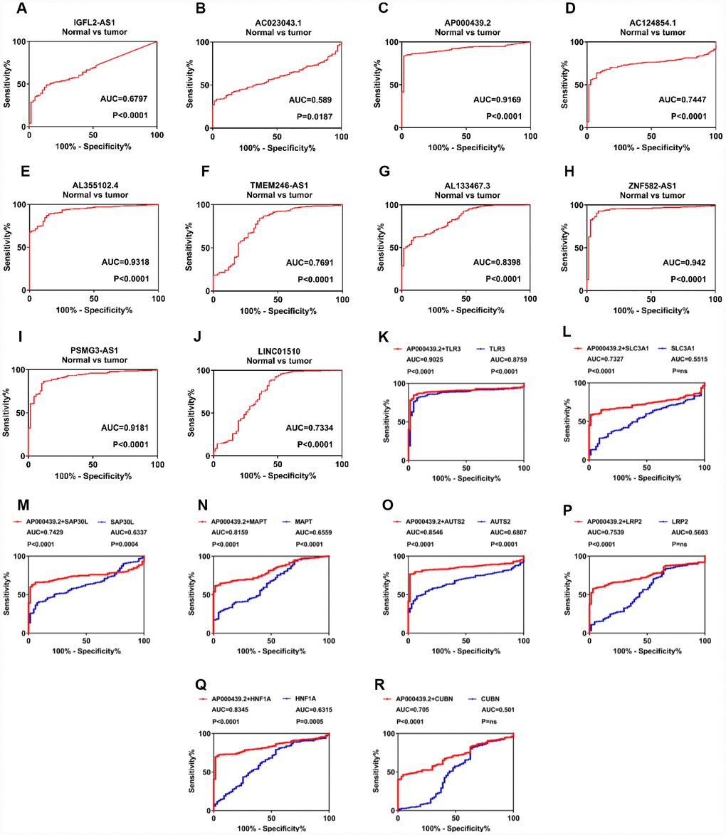 To further explore additional values when combining identified lncRNAs with known RCC biomarkers, we have performed ROC analysis for multi-gene diagnosis. Considering highest diagnostic value of AP000439.2 among four upregulated lncRNAs, 11 previously reported RCC biomarkers were selected and undertaken multivariate COX analysis with AP000439.2 (Supplementary Figure 17A). As shown in Figure 4K–4R, compared with single-gene diagnosis, AP000439.2 significantly improved diagnostic value of 8 reported RCC biomarkers, which indicated strong diagnostic efficacy of AP000439.2. However, no improvement of diagnostic accuracy was found when combining AP000439.2 with AQP1, HAO2 and PDZK1 respectively (Supplementary Figure 17B–17D).