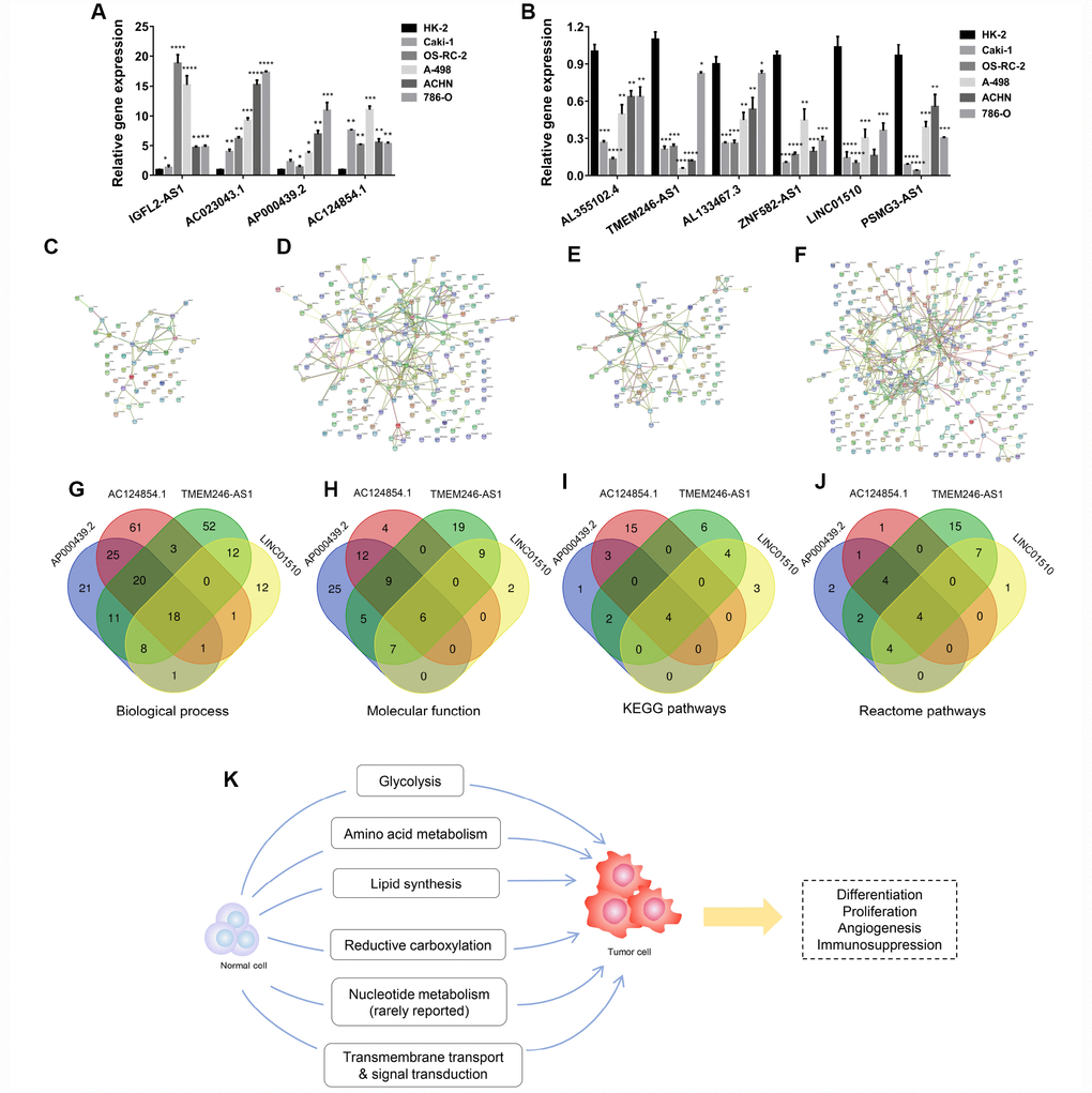 Apart from diagnostic and prognostic values in the clinic, we wanted to further explore which mechanisms these lncRNAs might participate in during ccRCC tumorigenesis. First, the lncRNA relative expression levels was verified in kidney cancer cell lines and 12 paired tumor and normal tissues (Figure 5A, 5B, Supplementary Figure 18A–18D, Supplementary Figure 19A–19F). As shown by the results, IGFL2-AS1, AC023043.1, AP000439.2 and AC124854.1 were upregulated in tumor cells and tissues, while AL355102.4, TMEM246-AS1, AL133467.3, ZNF582-AS1, LINC01510 and PSMG3-AS1 were downregulated in KIRC cell lines and tumors. Protein-protein interactions (PPI) network was constructed from STRING database and biological process, molecular function, KEGG pathways and Reactome pathways were presented. Four modules of the PPI networks were visualized. The corresponding lncRNAs were LINC01510 (Figure 5C), AP000439.2 (Figure 5D), TMEM246-AS1 (Figure 5E) and AC124854.1 (Figure 5F), respectively. Intersections of enrichment pathways were conducted with respect to biological process (Figure 5G), molecular function (Figure 5H), KEGG pathways (Figure 5I) and Reactome pathways (Figure 5J). Each kind of functional pathway is summarized and listed in the tables, if it was mapped to three or four lncRNAs (Supplementary Tables 38–41). Most functional pathways were enriched in cellular metabolic processes, such as glycolysis, amino acid metabolism, lipid synthesis, reductive carboxylation, nucleotide metabolism, transmembrane transport and signal transduction. To verify these, GSEA was also performed using the TCGA-KIRC database for each lncRNA. IGFL2-AS1 was enriched in cytokine-cytokine receptor interaction, the p53 and JAK-STAT signaling pathways (Supplementary Figure 20A), while AC023043.1 possibly participated in α-linolenic acid metabolism and the cytosolic DNA sensing pathway (Supplementary Figure 20B). AP000439.2 was found to involve renal cell carcinoma, fatty acid, tryptophan, histidine and glycerolipid metabolism, and the mTOR signaling pathway (Supplementary Figure 20C), while AC124854.1 might participate in the adipocytokine signaling pathway, renal cell carcinoma, histidine metabolism, mTOR signaling pathway and glycolysis gluconeogenesis (Supplementary Figure 21A). AL355102.4 was enriched in histidine, tryptophan, beta alanine, fatty acid and arginine-proline metabolism (Supplementary Figure 21B), while ZNF582-AS1 possibly participated in pentose and glucuronate interconversions, the pentose phosphate pathway, alanine aspartate-glutamate metabolism and the p53 signaling pathway (Supplementary Figure 22A). LINC01510 was involved in the p53 and Wnt signaling pathways, and cell cycle (Supplementary Figure 22B). Results from GSEA analysis were consistent with PPI enrichment pathways. These indicated that ccRCC progression was closely associated with metabolic mechanisms, including glycolysis, amino acid metabolism, lipid synthesis, reductive carboxylation, nucleotide metabolism, transmembrane transport and signal transduction, which were further associated with tumor cell proliferation, differentiation, angiogenesis and immunosuppression [26, 27] (Figure 5K).