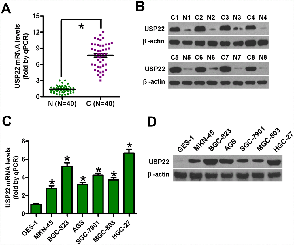 The biological functions of USP22 and the underlying signaling pathways involved in GC progression are not clear. Therefore, we investigated the status of USP22 expression in GC tissues and cell lines and its biological role in GC progression. Our findings demonstrate that USP22 is a key player in GC progression and a potential target for GC therapy.