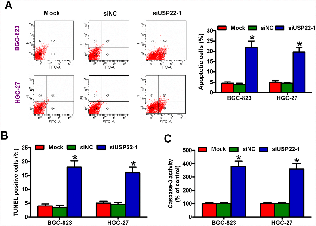 Next, we investigated the role of USP22 in the survival of GC cells. Analysis of AnnexinV/Propidium Iodide stained cells by flow cytometry showed significantly increased apoptosis in the USP22-silenced GC cells compared with the mock- and siNC-transfected GC cells (Figure 3A). USP22 silencing increased the percentage of TUNEL-positive BGC-823 and HGC-27 cells compared with the controls (Figure 3B). Moreover, USP22-silenced BGC-823 and HGC-27 cells showed significantly higher caspase-3 activity compared with the controls (Figure 3C). These data demonstrate that USP22 expression is required for the survival of GC cells in vitro.