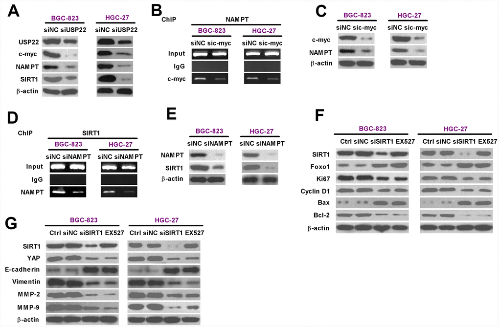 We further analyzed the role of USP22-dependent c-Myc/NAMPT/SIRT1 signaling in GC progression. SIRT1 silencing by siSIRT1 transfection of BGC-823 and HGC-27 cells or treatment of BGC-823 and HGC-27 cells with the SIRT1 inhibitor, EX527, showed significantly higher levels of FOXO1 and pro-apoptotic protein, Bax; concurrently, the levels of pro-proliferative proteins, Ki67 and Cyclin D1, and the anti-apoptotic protein, Bcl-2, were significantly lower (Figure 5F). Moreover, SIRT1 knockdown or SIRT1 activity inhibition by EX527 reduced the levels of YAP, vimentin (mesenchymal marker), MMP-2 and MMP-9, and increased the levels of E-cadherin expression (epithelial marker) in the BGC-823 and HGC-27 cells (Figure 5G). These data suggest that USP22 promotes GC progression by modulating c-Myc/NAMPT/ SIRT1-dependent FOXO1 and YAP signaling.