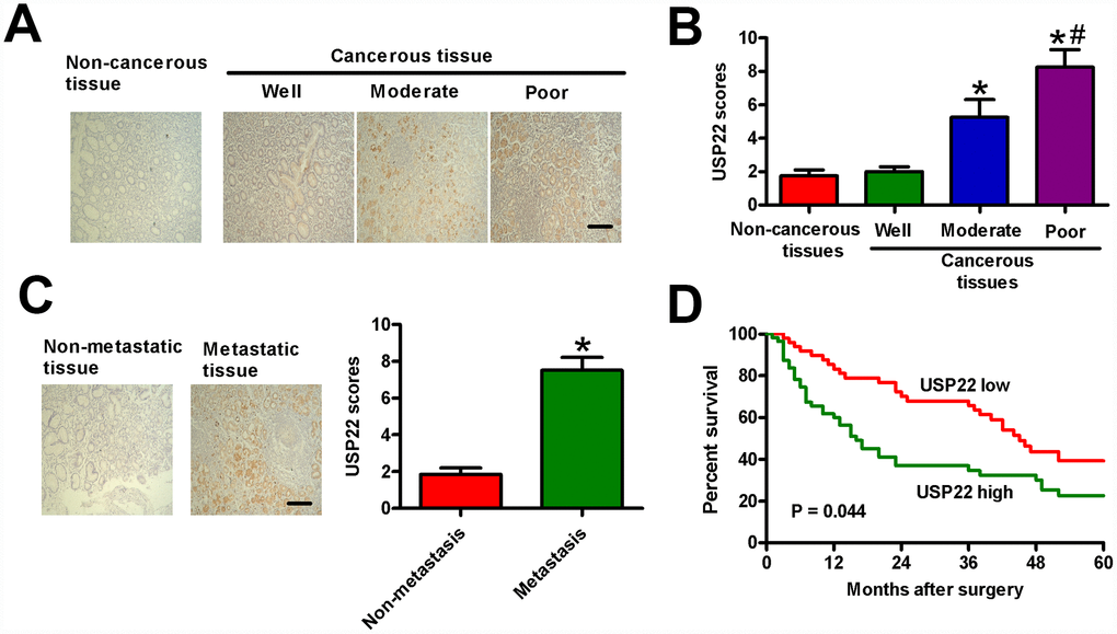 Upregulation of USP22 in GC tissues is positively associated with the advanced histological grade, metastasis, and poor prognosis