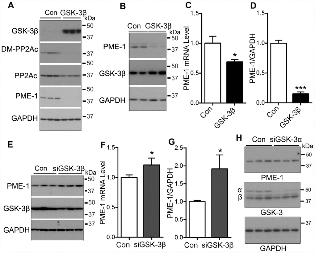 We previously reported that PI3K-GSK-3β regulates PP2Ac methylation [24]. To confirm the role of GSK-3β in PP2Ac methylation, we overexpressed GSK-3β in HEK-293T cells and analyzed PP2Ac methylation by Western blots. Consistently, we found that the levels of demethylated PP2A and PME-1 were clearly reduced in GSK-3β overexpressed cells (Figure 1A), supporting that GSK-3β suppresses PME-1 expression and PP2Ac demethylation.