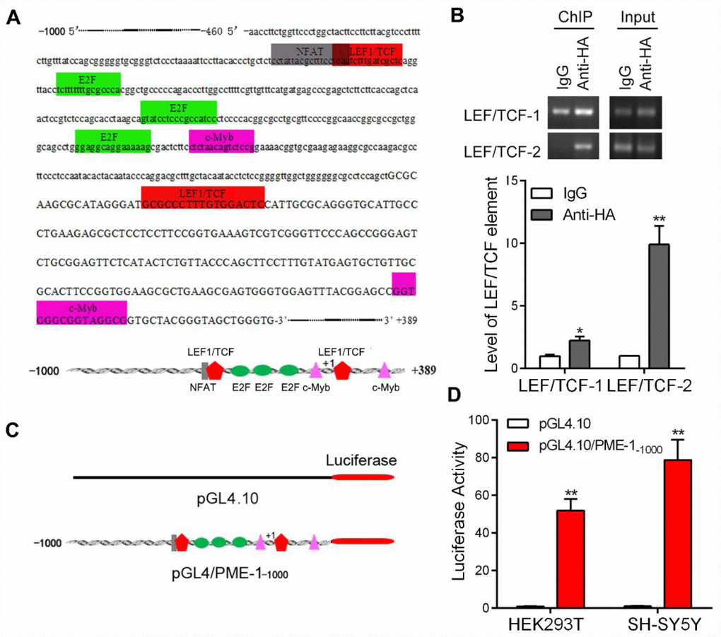 To determine whether β-catenin binds to the LEF1/TCF elements of PME-1 promoter, we performed the ChIP assay in SH-SY5Y cells. We overexpressed β-catenin tagged with HA at the N-terminus in SH-SY5Y cells and immunoprecipitated β-catenin by anti-HA and then the bound DNA fragments were amplified by PCR to analyze co-immunoprecipitated LEF1/TCF elements of human PME-1 promoter. We found that anti-HA, but not control IgG, was able to co-immunoprecipitate two LEF1/TCFcis-elements 1 and 2 (Figure 2B), suggesting that β-catenin may regulate PME-1 expression through the LEF1/TCF elements.