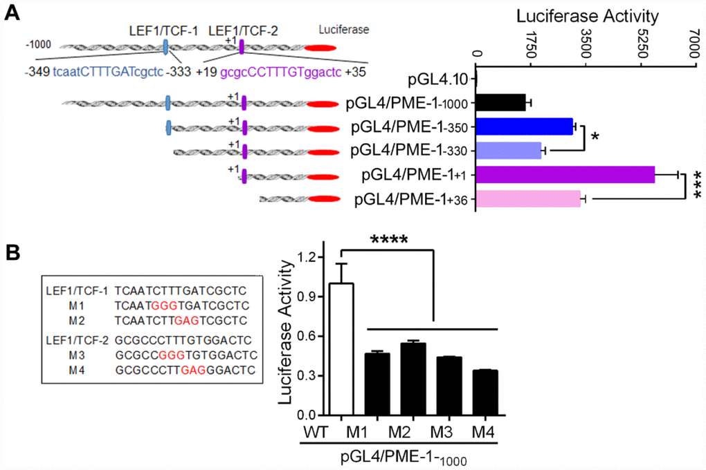 To further verify the role of two LEF1/TCF elements in promoting PME-1 expression, we mutated two LEF1/TCFs (Figure 3B) and measured the luciferase activity. We found that M1, M2, M3 and M4 caused significant reduction of luciferase activity (Figure 3B), confirming that LEF1/TCF elements 1 and 2 both promote the expression of PME-1.