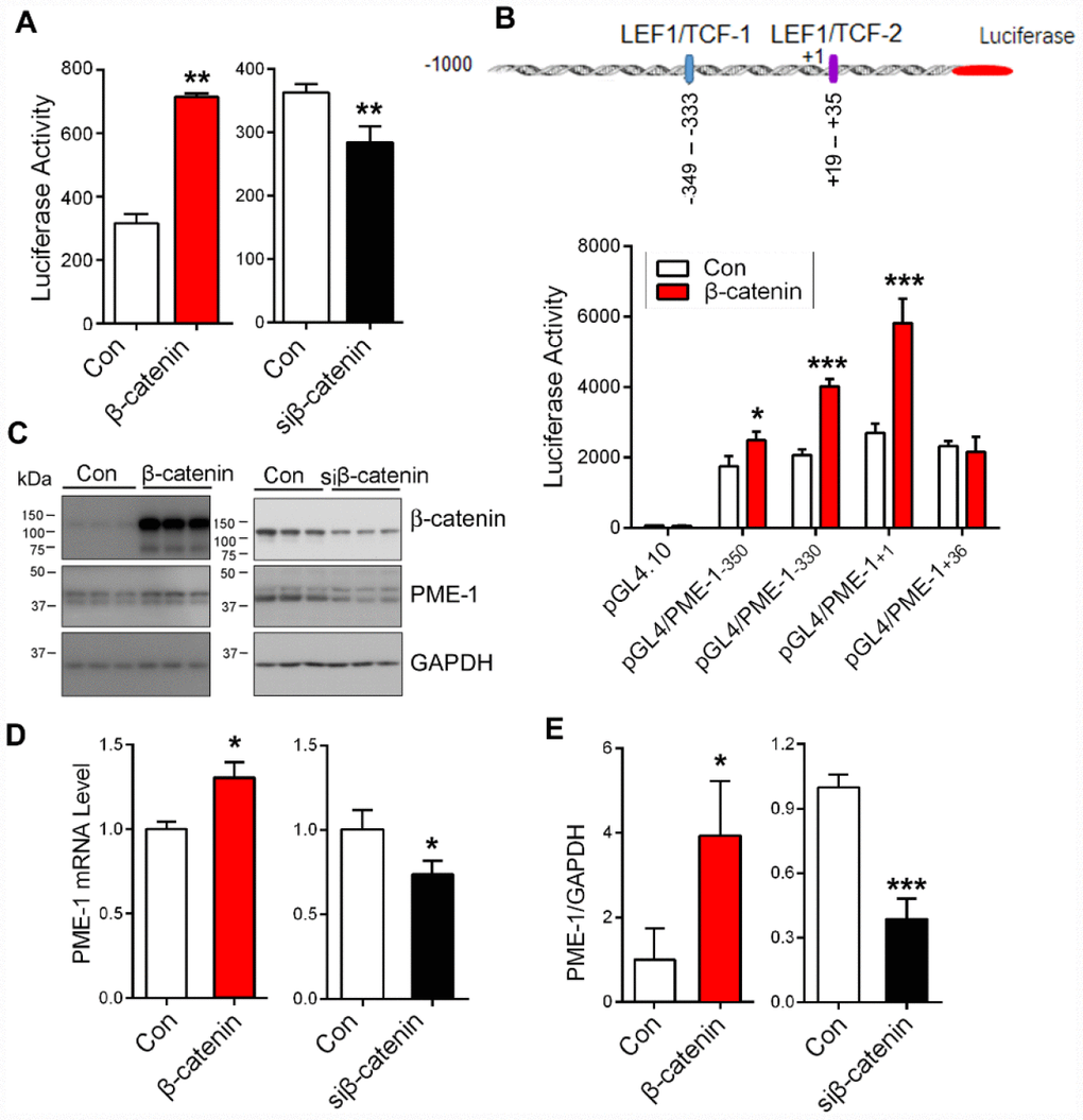 To determine the role of β-catenin in endogenous PME-1 expression, we overexpressed β-catenin or siβ-catenin in HEK-293T cells and analyzed PME-1 expression by qPCR and Western blots. We found that overexpression of β-catenin elevated the levels of endogenous PME-1 mRNA (Figure 4D) and protein (Figure 4C, 4E). Knockdown of β-catenin showed the opposite results in the protein (Figure 4C, 4E) and mRNA level (Figure 4D). Taking together, these results indicate that β-catenin also enhances the endogenous PME-1 expression.