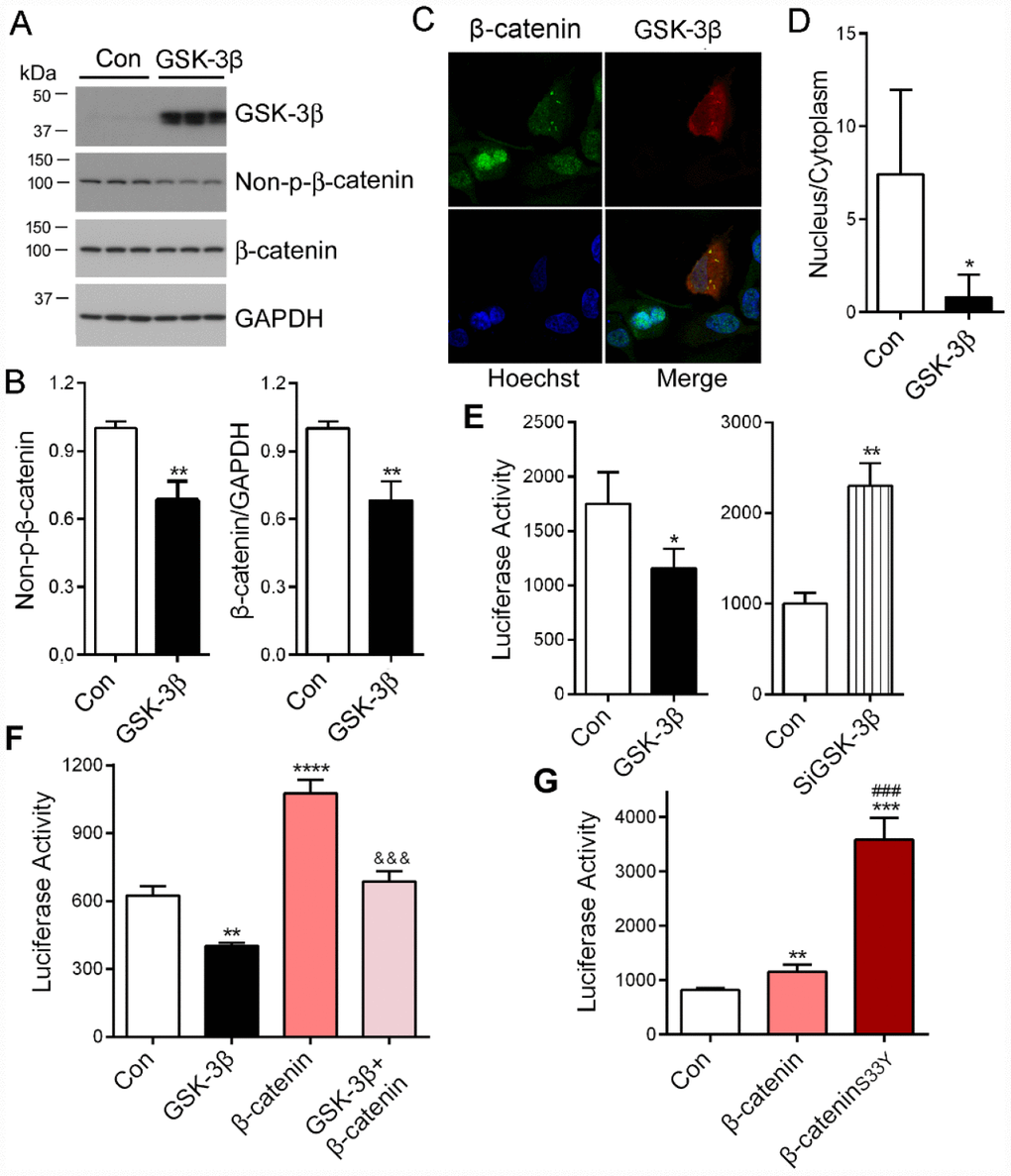 β-catenin is a known substrate of GSK-3β [28]. To investigate the role of GSK-3β in β-catenin-regulated PME-1 expression, we overexpressed GSK-3β in HEK-293T cells and analyzed β-catenin phosphorylation by Western blots and nuclear location by immunofluorescence staining. We found that overexpression of GSK-3β significantly decreased the levels of total and non-phosphorylated β-catenin at Ser33, Ser37 and Thr41 (Non-p-β-catenin) (Figure 5A, 5B) and suppressed its nuclear translocation (Figure 5C, 5D). Consistent with the previous study [29], these results suggest that GSK-3β phosphorylates β-catenin and suppresses its nuclear translocation.