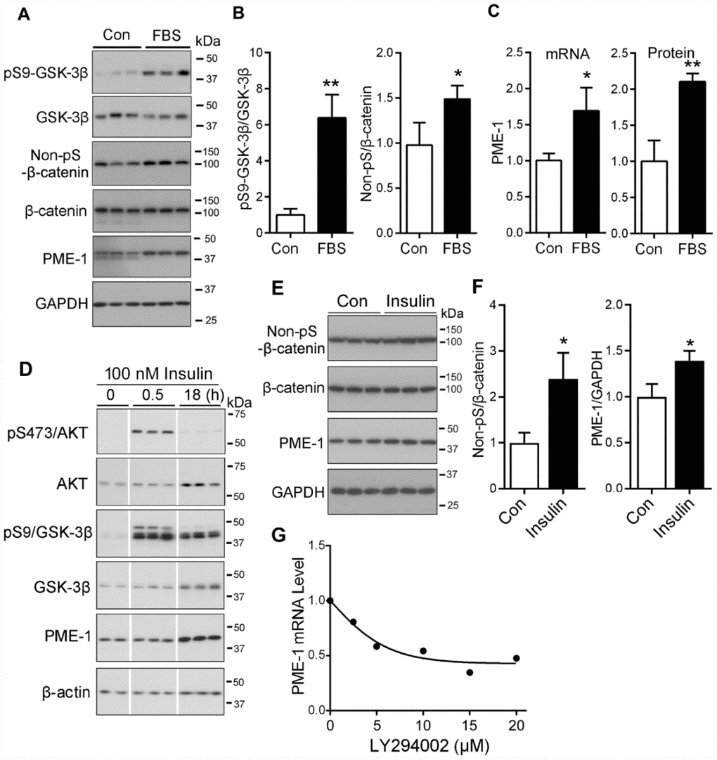 Activation of PI3K-AKT signaling leads to inhibition of GSK-3β activity by phosphorylation at Ser9. To inhibit GSK-3β, we treated HEK-293T cells with 2% fetal bovine serum (FBS) for 24 hr to activate PI3K-AKT and analyzed the phosphorylation of GSK-3β and β-catenin by Western blots. We found that FBS induced the increase in phosphorylation of GSK-3β at Ser9 (Figure 6A, 6B) and increase of Non-pS-β-catenin (Figure 6A, 6B), compared with the cells cultured without serum. The levels of PME-1 mRNA and protein were increased in FBS treated cells (Figure 6C). Thus, inhibition of GSK-3β by activation of PI3K/AKT signaling suppressed β-catenin phosphorylation, leading to an increase in the expression of PME-1.