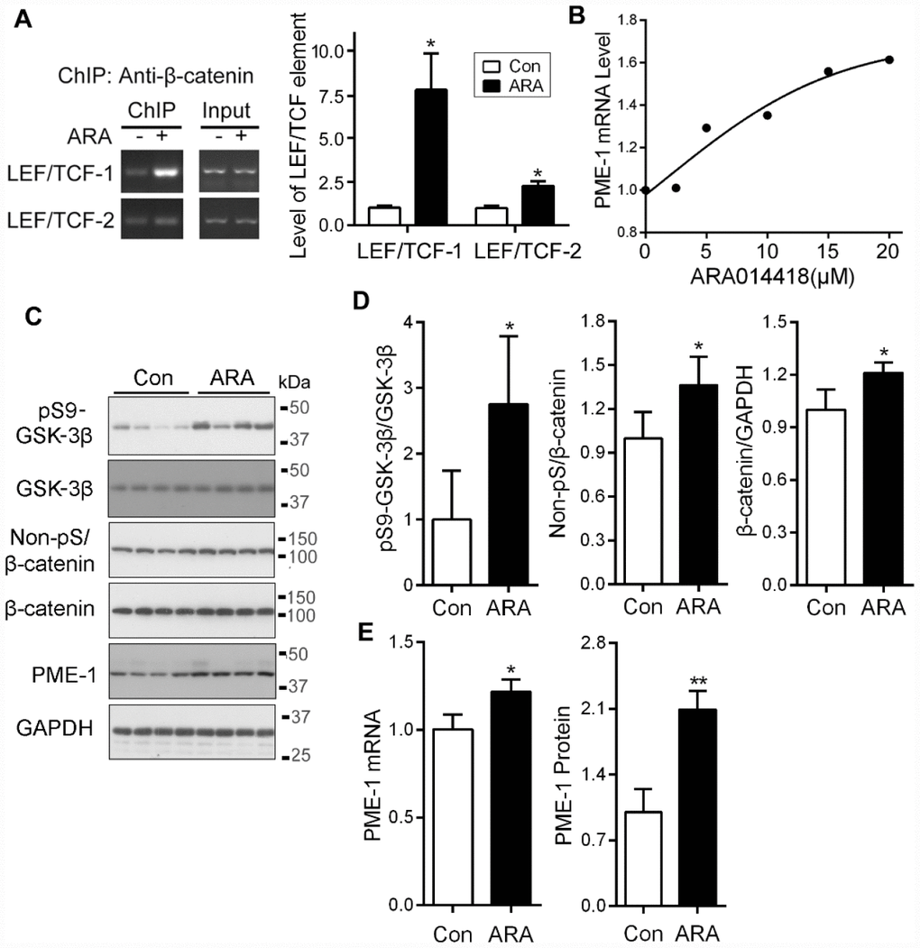 To study the effect of GSK-3β on the expression of PME-1 in vivo, we injected 2 μl of 5 mM ARA014418 intracerebroventricularly in mice and analyzed the expression of PME-1 48 hr after injection by Western blots and qPCR in cerebral cortex. We found that ARA014418 increased levels of phosphorylation of GSK-3β at Ser9, non-phosphorylated β-catenin at Ser33, Ser37 and Thr41 and of total β-catenin (Figure 7C, 7D). Furthermore, the levels of PME-1 mRNA and protein were significantly increased in ARA014418 treated mice (Figure 7C, 7E). Thus, inhibition of GSK-3β enhances PME-1 expression in vivo.