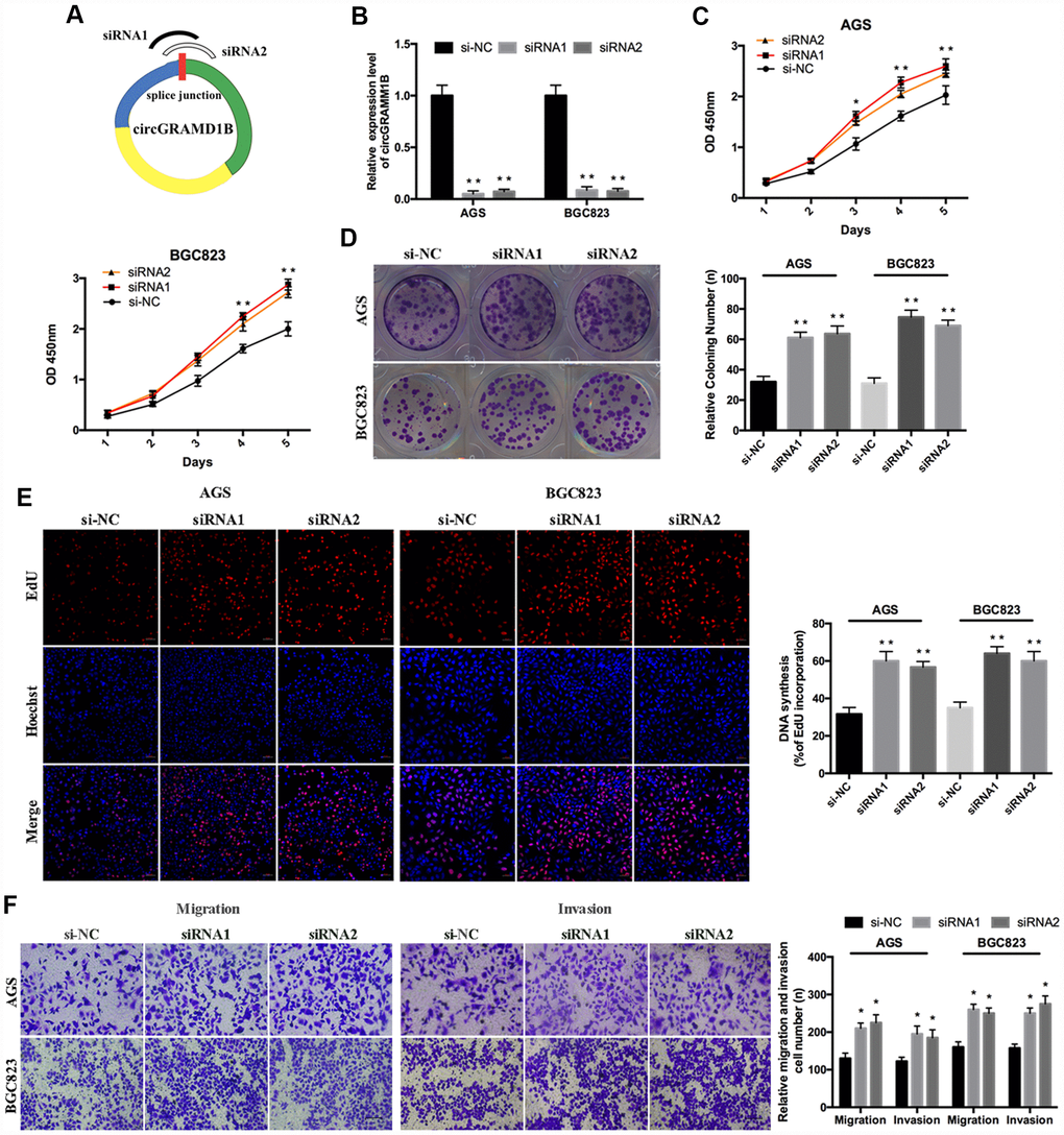 Given that circGRAMD1B is downregulated in GC tissues and cell lines in our study, we further investigated its potential functional role by overexpressing circGRAMD1B in MGC803 and SGC7901 cell lines. MGC803 and SGC7901 cells were transfected with the circGRAMD1B overexpression vector or the control vector, and qRT-PCR was performed to detect the effect of circGRAMD1B overexpression (Figure 2A). The extraction and sequencing of RNA obtained from GC cells overexpressing circGRAMD1B confirmed that the overexpressed circGRAMD1B was circular rather than linear. Functionally, CCK-8, and colony assays demonstrated that overexpression of circGRAMD1B repressed the cell viability and colony formation abilities of MGC803 and SGC7901 cells (Figure 2B, 2C). EdU assay showed that the DNA synthesis of MGC803 and SGC7901 cells was retarded by overexpression of circGRAMD1B, as compared with the control group (Figure 2D). Transwell migration and invasion assays showed that the overexpression of circGRAMD1B significantly suppressed the migration and invasion abilities of MGC803 and SGC7901 cells (Figure 2E). The wound-healing assay also indicated that the cell migration capabilities of MGC803 and SGC7901 cells were significantly weakened by overexpression of circGRAMD1B (Figure 2F). Besides, we further investigated the potential functional role of circGRAMD1B through loss-of-function experiments in GC cell lines. We analyzed the siRNA1/siRNA2 sequence of circGRAMD1B at splice junctions accordingly (Figure 3A). AGS and BGC823 cells were transfected with circGRAMD1B siRNA1/siRNA2 or the si-NC for 48 h, and then qRT-PCR was performed to determine the silencing effect of circGRAMD1B (Figure 3B). Functionally, CCK-8, colony formation, and EdU assays indicated that cell proliferation ability and colony formation were significantly increased after the silencing of circGRAMD1B (Figure 3C–3E). The silencing of circGRAMD1B significantly promoted the migration and invasion abilities of AGS and BGC823 cells (Figure 3F). These results of the in vitro experiments strongly suggest that circGRAMD1B is a novel tumor suppressor in GC progression.