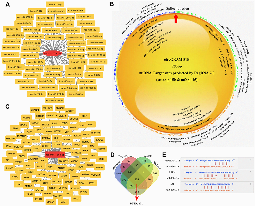 Previous studies have reported that cytoplasmic circRNAs can function as miRNA sponges and then regulate gene expression [8, 10]. In this study, by bioinformatics analysis and predictive websites, we detected 59 miRNAs that share the MREs of circGRAMD1B (Figure 4A), which might bind. As shown in Figure 4B (RegRNA 2.0 prediction, miRNA Target Sites: score ≥ 150 and mfe ≤ -15), we found that miR-130a-3p had a putative binding site with circGRAMD1B. A miRNA microarray of human GC from the TCGA database (DIANA: mirExTra 2.0) was used to analyze the miRNA expression profile in paired GC tissues and noncancerous tissues. Based on the fold change and P-value, we found that hsa-miR-130a-3p, hsa-miR-130b-3p, and hsa-miR-98-5p were the three miRNAs with the most significant differential expression. miR-130a-3p showed a higher probability of binding to circGRAMD1B on most predictive websites; therefore, we selected miR-130a-3p as a sponge for circGRAMD1B for further study. Furthermore, according to the ceRNA regulatory model in tumor cells, the DIANA TarBase, TargetScan, mirDIP, and StarBase database showed supported interactions between the experimental mRNAs and hsa-miR-130a-3p. Although miR-130a-3p was predicted to have approximately 375 downstream target genes, only 100 reliable target genes, including PTEN and p21, were added to our predicted picture (Figure 4C, 4D). In total, we performed integrated bioinformatics analysis and found that circGRAMD1B and the 3′-UTR of both PTEN/p21 share the same MREs of miR-130a-3p, which suggested an association between circGRAMD1B and PTEN/p21 in GC (Figure 4E).