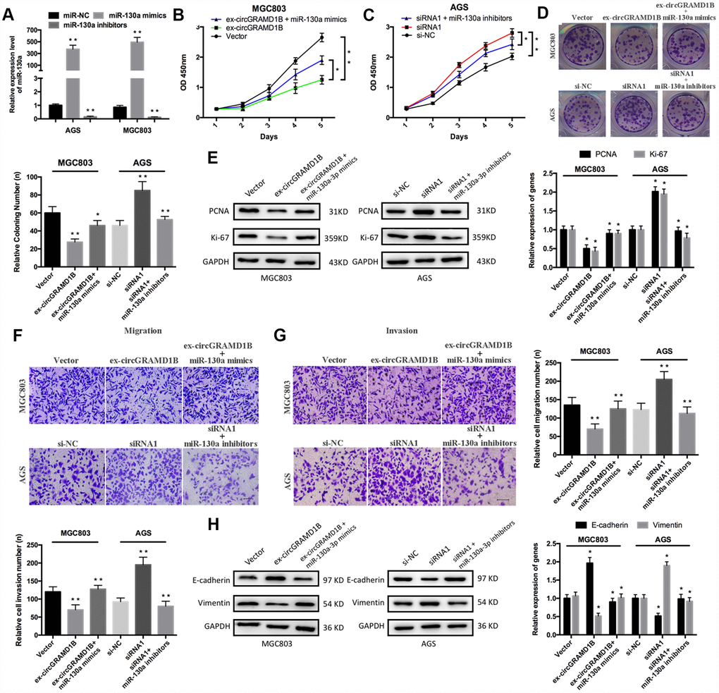 To further investigate the roles of miR-130a-3p and circGRAMD1B in GC progression, we performed rescue experiments, such as CCK-8, colony formation, and Transwell assays, to evaluate the effects of the circGRAMD1B/miR-130a-3p axis in GC cells. miR-130a-3p expression was increased or decreased after MGC803 and AGS cells were transfected with miR-130 mimics or inhibitors, respectively (Figure 6A). CCK-8 assay indicated that circGRAMD1B inhibited MGC803 cell proliferation and that miR-130a-3p mimics attenuated this inhibition (Figure 6B). Moreover, the silencing of circGRAMD1B promoted AGS cell proliferation, and the miR-130a-3p inhibitors weakened this promotion (Figure 6C). The cloning formation assay showed similar proliferation effects (Figure 6D). circGRAMD1B also decreased the expression levels of proliferation-associated markers (PCNA and Ki-67), and miR-130a-3p mimics reversed this tendency. The silencing of circGRAMD1B increased the expression levels of proliferation-associated markers (PCNA and Ki-67), and miR-130a-3p inhibitors reversed this tendency (Figure 6E). Furthermore, Transwell analysis showed that circGRAMD1B reduced MGC803 cell migration and invasion and that miR-130a-3p mimics attenuated this suppression. Moreover, the silencing of circGRAMD1B increased AGS cell migration and invasion, and miR-130a-3p inhibitors weakened this acceleration (Figure 6F, 6G). Western blot assays revealed that the circGRAMD1B/miR-130a-3p axis regulated the expression of epithelial-mesenchymal transition (EMT) markers (E-cadherin and Vimentin) in GC cells (Figure 6H). These data indicated that circGRAMD1B functions as a ceRNA to suppress GC progression partly by abolishing the oncogenic effect of miR-130a-3p.