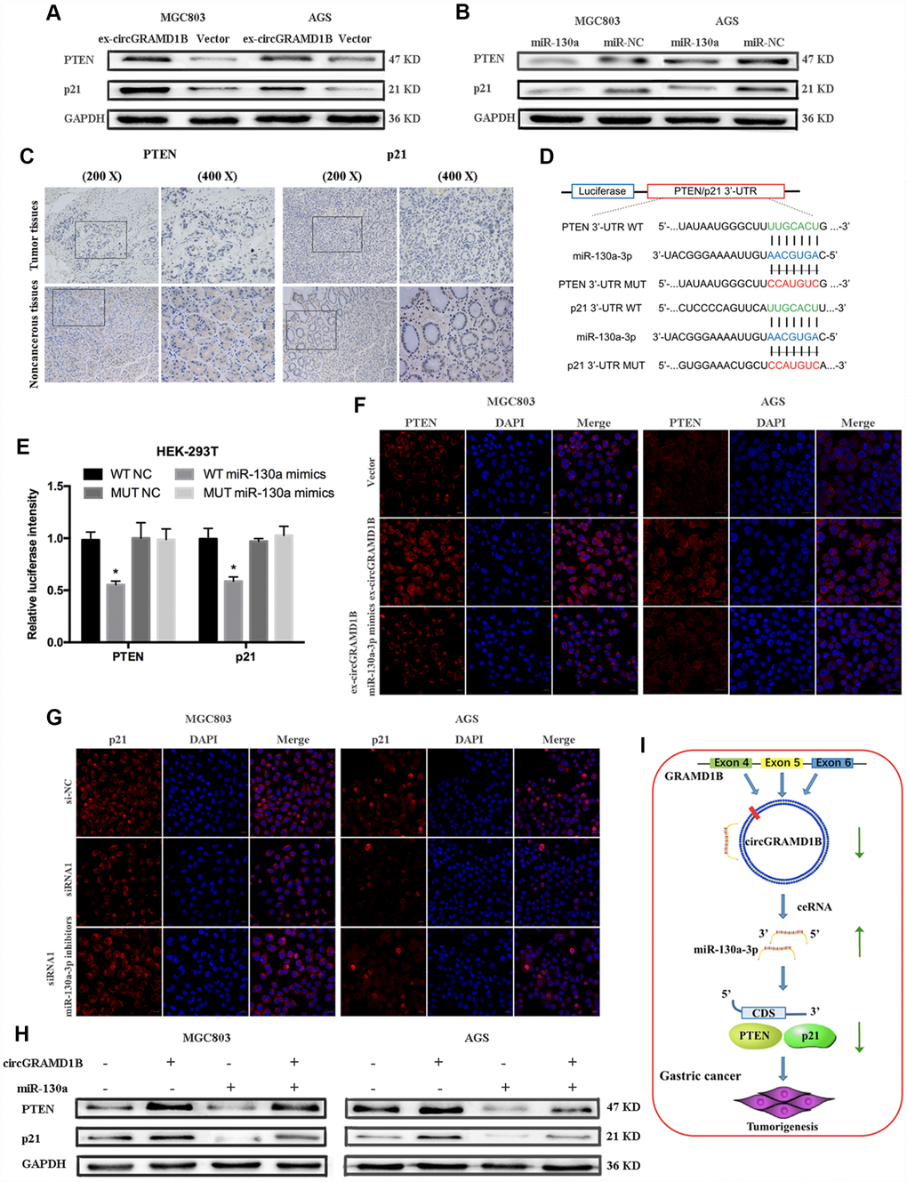 We further explored which downstream molecule might be affected by the circGRAMD1B/miR-130a-3p axis to regulate the GC phenotype. Based on results from the combination of several predictive websites, we found that PTEN and p21 were the target genes of miR-130a-3p and may be regulated by circGRAMD1B in GC. We selected PTEN and p21 as the possible downstream target genes of miR-130a-3p. First, the results showed that PTEN and p21 expression had the same tendency as that of circGRAMD1B (Figure 7A), while miR-130a-3p expression reduced the expression of PTEN and p21 (Figure 7B). These results suggest that PTEN and p21 may partly serve as downstream factors in the circGRAMD1B/miR-130a-3p axis. Then, we confirmed the expression of PTEN and p21 in four paired GC tissues and paired noncancerous tissues via IHC, and the results indicated that they exhibited low expression in GC tissues (Figure 7C). Consequently, a luciferase reporter assay was performed, and cotransfection of miR-130a-3p mimics and wild reporter plasmids strongly reduced luciferase activity. Conversely, cotransfection of miR-130a-3p mimics and mutated vectors showed no obvious effect on luciferase activity (Figure 7D, 7E). Indeed, IF (Figure 7F, 7G) and Western blot (Figure 7H) assays revealed that circGRAMD1B significantly regulates the expression of PTEN and p21, respectively, via miR-130a-3p. These data provide evidence that the role of circGRAMD1B in suppressing GC progression is primarily dependent on the miR-130a-PTEN/p21 axis (Figure 7I).
