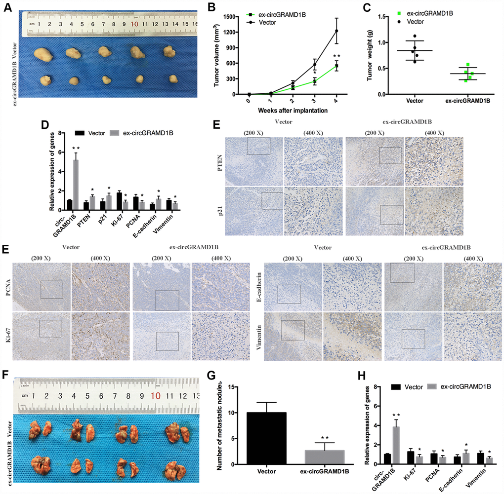 To determine the effects of circGRAMD1B on tumor growth and lung metastasis in vivo, MGC803 cells transfected with stable circGRAMD1B vector or control vector were injected subcutaneously into nude mice. Consistent with the in vitro data, a smaller volume and lighter weight of xenograft tumors were observed in the circGRAMD1B overexpressing group compared to the control group (Figure 8A–8C). Additionally, overexpression of circGRAMD1B triggered a reduction of Ki-67, PCNA, and Vimentin expression, while an increase of circGRAMD1B, PTEN, p21, and E-cadherin mRNA level in excised tumor masses (Figure 8D). The IHC assay showed that in the dissected tumors, circGRAMD1B overexpression enhanced the immunostaining of PTEN, p21, and E-cadherin expression and reduced the immunostaining of Ki-67, PCNA, and Vimentin expression (Figure 8E). We then intravenously injected the abovementioned cells into nude mice to construct a lung metastasis model. As expected, the number of metastatic lesions in the lungs was lower in the circGRAMD1B overexpression group than in the control group (Figure 8F, 8G). In the lung metastasis model, the mRNA levels of Ki-67, PCNA, and Vimentin were decreased in the circGRAMD1B overexpression group compared with the control group, while E-cadherin level was increased in the circGRAMD1B overexpression group (Figure 8H). The results of the in vivo experiments also suggest that circGRAMD1B is a novel tumor suppressor in GC progression and metastasis.