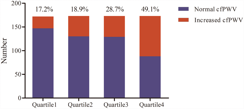 Percentages of cfPWV ≥10 m/s in different quartiles of homocysteine levels are demonstrated in Figure 1. cfPWV ≥10 m/s was more frequently present in the higher quartile. A striking increase in the percentage of cfPWV ≥10 m/s was found from the third quartile to the highest quartile (17.2%, 18.9%, 28.7%, and 49.1%, χtrend = 54.097, P < 0.001).
