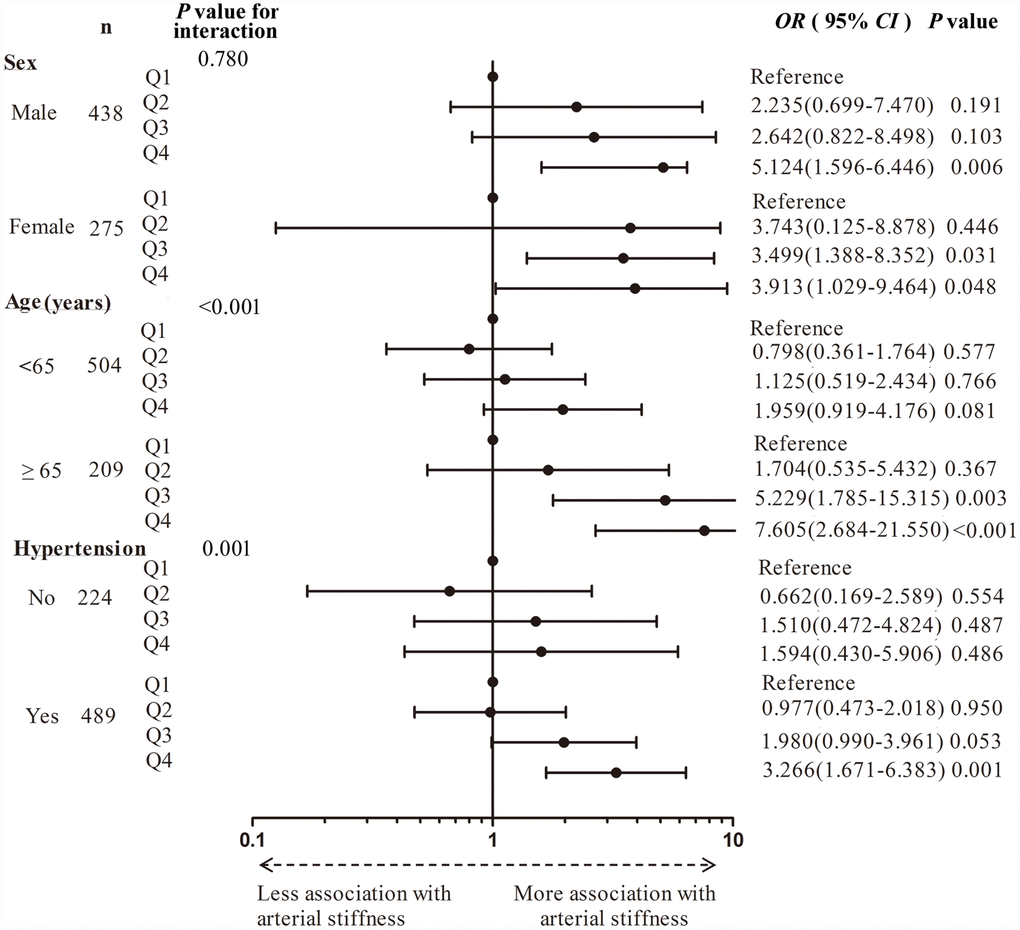 Before further stratification, interaction analyses were performed. Age and presence of hypertension were found to significantly modify the association of the quartile of homocysteine levels with cfPWV ≥10 m/s. After gender stratification, a significant association between the quartile of homocysteine levels and cfPWV ≥10 m/s was observed in both male and female patients. This association appeared to be more prominent in male patients. After age stratification, a significant association was present only in patients older than 65 years, but not those younger than 65 years. The elderly in the highest quartile of homocysteine levels had a 6.6-fold increased risk of cfPWV ≥10 m/s compared with those in the lowest quartile (highest quartile: OR = 7.605, 95% CI: 2.684–21.550, P < 0.001). After stratification of hypertension, a significant association persisted in patients with hypertension. Patients in the highest quartile had an almost 2.3-fold increased risk of cfPWV ≥10 m/s compared with those in the lowest quartile (highest quartile: OR = 3.266, 95% CI: 1.671–6.383, P = 0.001). However, the association became weak in patients without hypertension (Figure 3).