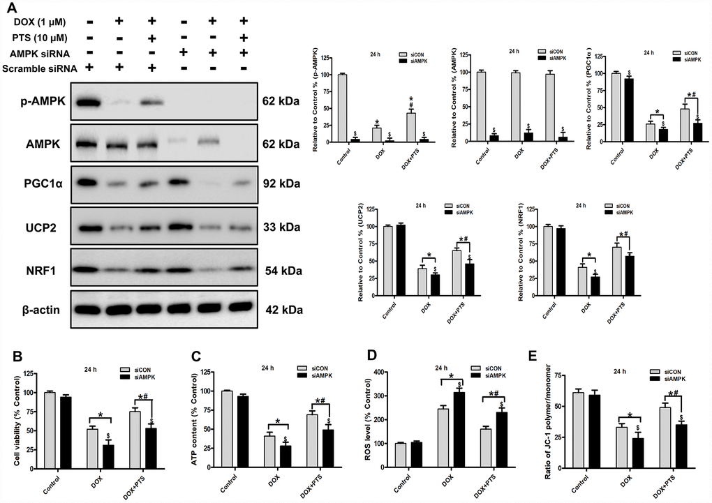 Our previous study reported that AMPK was a potential upstream regulator on PGC1α signaling, and activation of AMPK-PGC1α cascades was involved in myocardial protection [4]. To investigate the action of AMPK on the myocardial protection of pterostilbene against DOX-cytotoxicity in vitro, a specific AMPK siRNA was applicated to knockdown the AMPK expression in the H9c2 cells. Western blot analyses showed that knockdown of AMPK hindered pterostilbene application-exerted increase of PGC1α and its downstream signaling (NRF1 and UCP2) protein levels in H9c2 cells with DOX exposure (vs. DOX + PTS group, P < 0.05, Figure 2A). Additionally, compared with the pterostilbene and DOX cotreatment group, AMPK knockdown significantly prevented the pterostilbene cotreatment-exerted rise in H9c2 cell viability, preservation of ΔΨm, cellular ATP content and the decrease of ROS generation with DOX-exposure (P < 0.05, Figure 2B–2E). Therefore, AMPK activation was involved in the pterostilbene-induced heart protection against DOX-cytotoxicity via PGC1α upregulation.