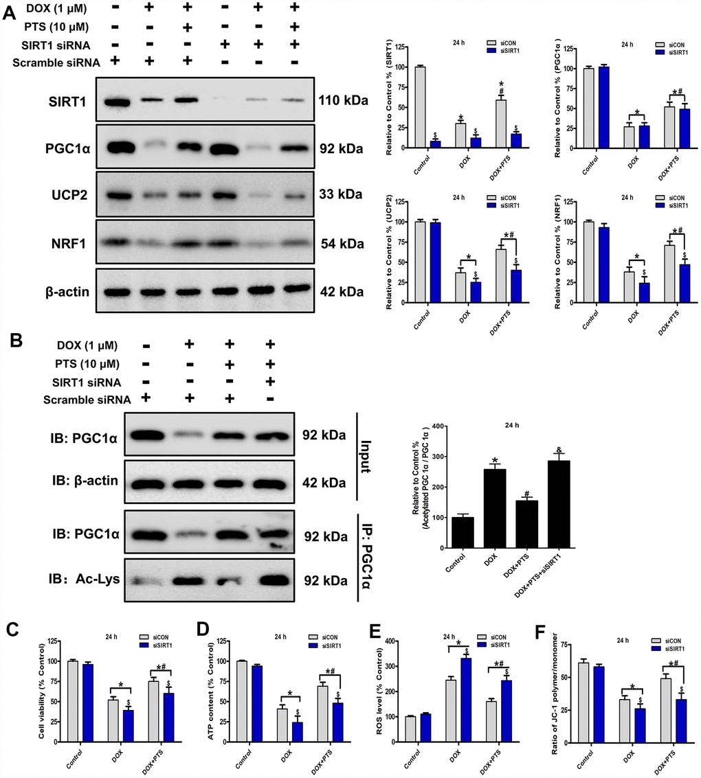 SIRT1 is a well-known deacetylase and involved in cardiac protection and mitochondrial biogenesis through its posttranslational deacetylation of PGC1α protein [16]. The activity of PGC1α is regulated by the post-translational level, and acetylation of PGC1α leads to the decrease of its transcriptional ability [19]. In present study, we found cotreatment of pterostilbene markedly increased the SIRT1 expression and decreased the acetylated PGC1α level (vs. DOX group, P < 0.05, Figure 3A and 3B). To explore the action of SIRT1 on the protective effects of pterostilbene against DOX-induced cardiotoxicity in vitro, the SIRT1 was knockdown after SIRT1 specific siRNA application on the H9c2 cells. Western blot analyses revealed that SIRT1 knockdown markedly promoted PGC1α acetylation without influencing PGC1α expression, and downregulated the UCP2 and NRF1 levels in the DOX + PTS + SIRT1 siRNA group compared with the DOX + PTS group (P < 0.05, Figure 3A and 3B). Moreover, compared with the pterostilbene and DOX cotreatment group, SIRT1 knockdown partially reversed the pterostilbene cotreatment-exhibited upregulation of H9c2 cell viability, ΔΨm and cellular ATP content, and the decrease of ROS generation during DOX-exposure (P < 0.05, Figure 3C–3F). These results suggested that SIRT1 participated in the pterostilbene exerted protection against DOX-induced cardiotoxicity via PGC1α deacetylation (activation).