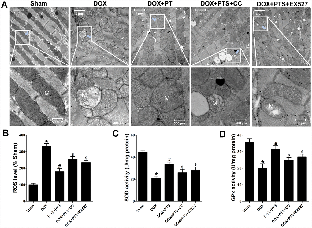 The mitochondrial damage and concomitant oxidative stress injury were considered to be an important cause of DOX-cardiomyopathy. After DOX exposure for 6 days, compared with sham group, transmission electron microscopy examination on heart tissues showed the obvious disorders in ultrastructural mitochondrial morphology including mitochondrial swelling with cristae disorientation and breakage in the DOX-treated hearts (Figure 4A). Interestingly, pterostilbene cotreatment alleviated the DOX-induced injury on mitochondria through normalizing cristae density and architecture (Figure 4A). Moreover, pterostilbene cotreatment markedly downregulated the ROS generation and promoted the SOD and GPx activities in the DOX-exhibited hearts (vs. DOX group, P < 0.05, Figure 4B–4D). However, when compared with the DOX + PTS group, cotreatment of compound C (a selective AMPK inhibitor) or EX527 (a selective SIRT1 inhibitor) with pterostilbene clearly mitigated the mitochondrial protective and anti-oxidative effects of pterostilbene on DOX-stimulated hearts (Figure 4A–4D). Pterostilbene application combined with DOX and compound C or EX527 showed severe mitochondrial disorders (Figure 4A), as well as increase of ROS level and decreases in GPx and SOD activities (vs. DOX + PTS group, P < 0.05, Figure 4B–4D).