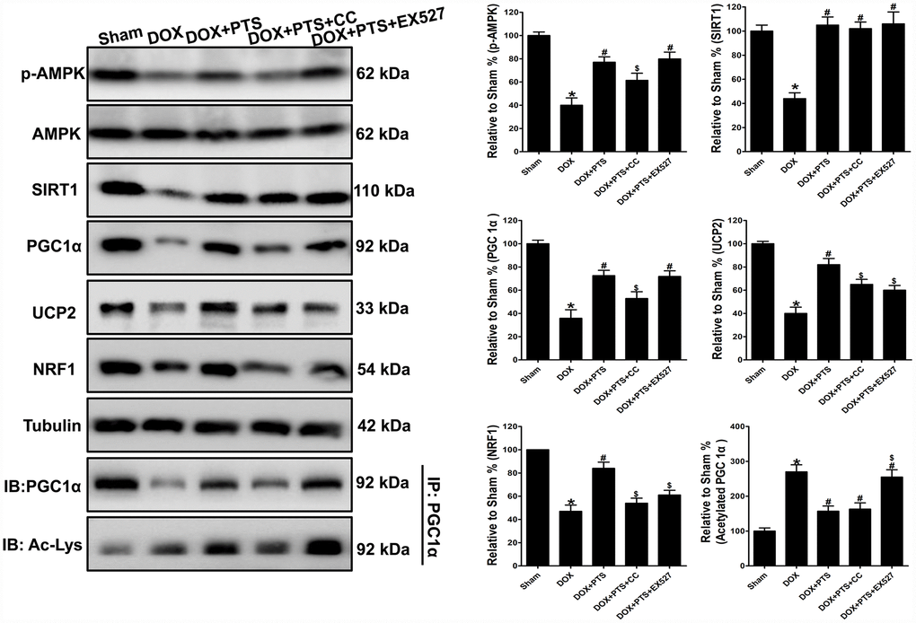 Western blot analyses were applied in the invivo study, and we found pterostilbene treatment markedly upregulated the p-AMPK and SIRT1 levels, and inhibited the PGC1α acetylation and promoted the expression of PGC1α and its downstream signaling (NRF1 and UCP2) proteins in DOX + PTS group (vs. DOX group, P < 0.05, Figure 5). Interestingly, cotreatment of AMPK inhibitor compound C markedly antagonized pterostilbene induced- upregulation of p-AMPK, PGC1α, NRF1 and UCP2 levels in the DOX + PTS + CC group (vs. DOX + PTS group, P < 0.05, Figure 5). Moreover, SIRT1 activity inhibition by EX527 cotreatment significantly reversed pterostilbene promoted PGC1α deacetylation and the increase of NRF1 and UCP2 expression in the DOX + PTS + EX527 group (vs. DOX + PTS group, P < 0.05, Figure 5). Taken together, above results indicated that AMPK activation-induced PGC1α upregulation and SIRT1 activation-promoted PGC1α deacetylation were involved in the pterostilbene-exerted myocardial protection against DOX-cytotoxicity.