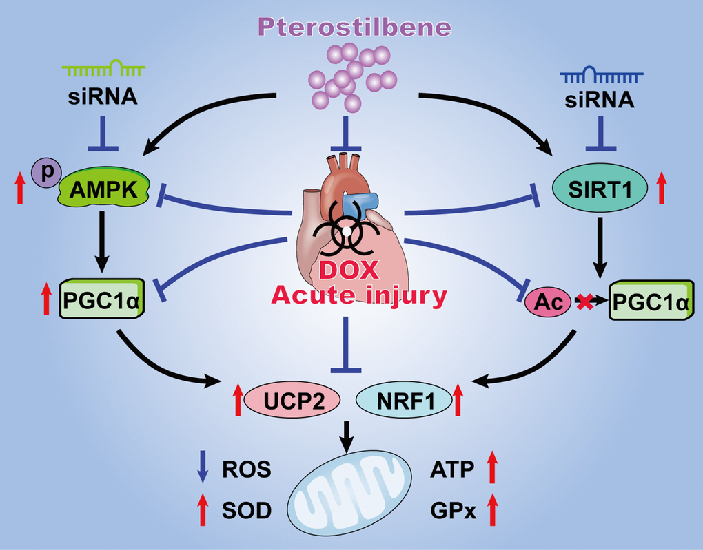 Peroxisome proliferator-activated receptor coactivator 1α (PGC1α) is a vital transcriptional coactivator in regulating mitochondrial functions and maintaining mitochondrial homeostasis through mediating the expression of uncoupling protein 2 (UCP2), nuclear respiratory factor 1 (NRF1), etc [4, 15]. The level and activity of PGC1α are particularly vulnerable to DOX exposure thus leading to the DOX-induced mitochondrial damage [15]. The activity of PGC1α could be posttranslational hindered via acetylation [16]. Moreover, PGC1α’s expression and activity are stimulated by its upstream regulator adenosine monophosphate activated protein kinase (AMPK) and sirtuin1 (SIRT1) [2, 4, 17]. Interestingly, AMPK and SIRT1 are also inhibited after DOX exposure in cardiomyocytes [4, 16, 18]. In present study, we aimed to verify whether pterostilbene could exert cardiac protection against acute DOX-cardiotoxicity via the mechanism of alleviating mitochondrial oxidative stress through activating the AMPK/SIRT1-PGC1α cascades.